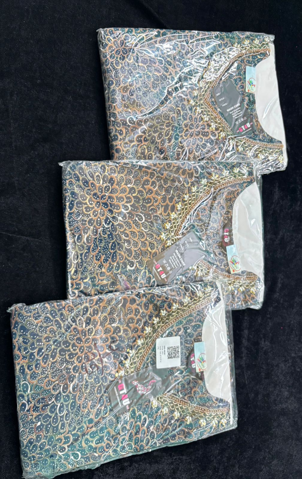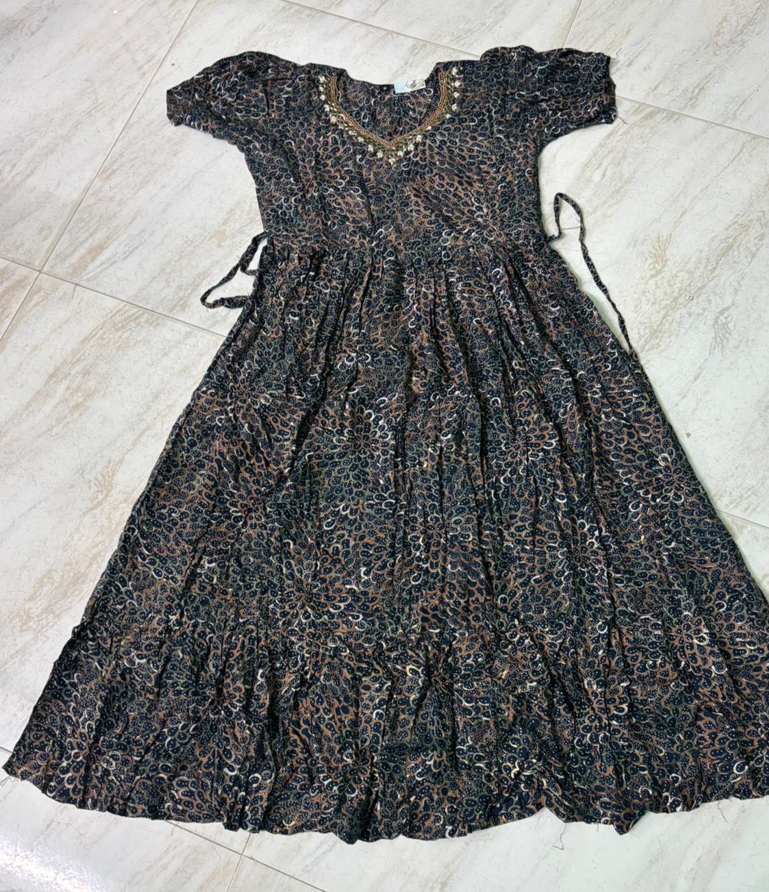 Blue color cotton frock with floral printed and beeds work. Available in M, L, XL, XXL