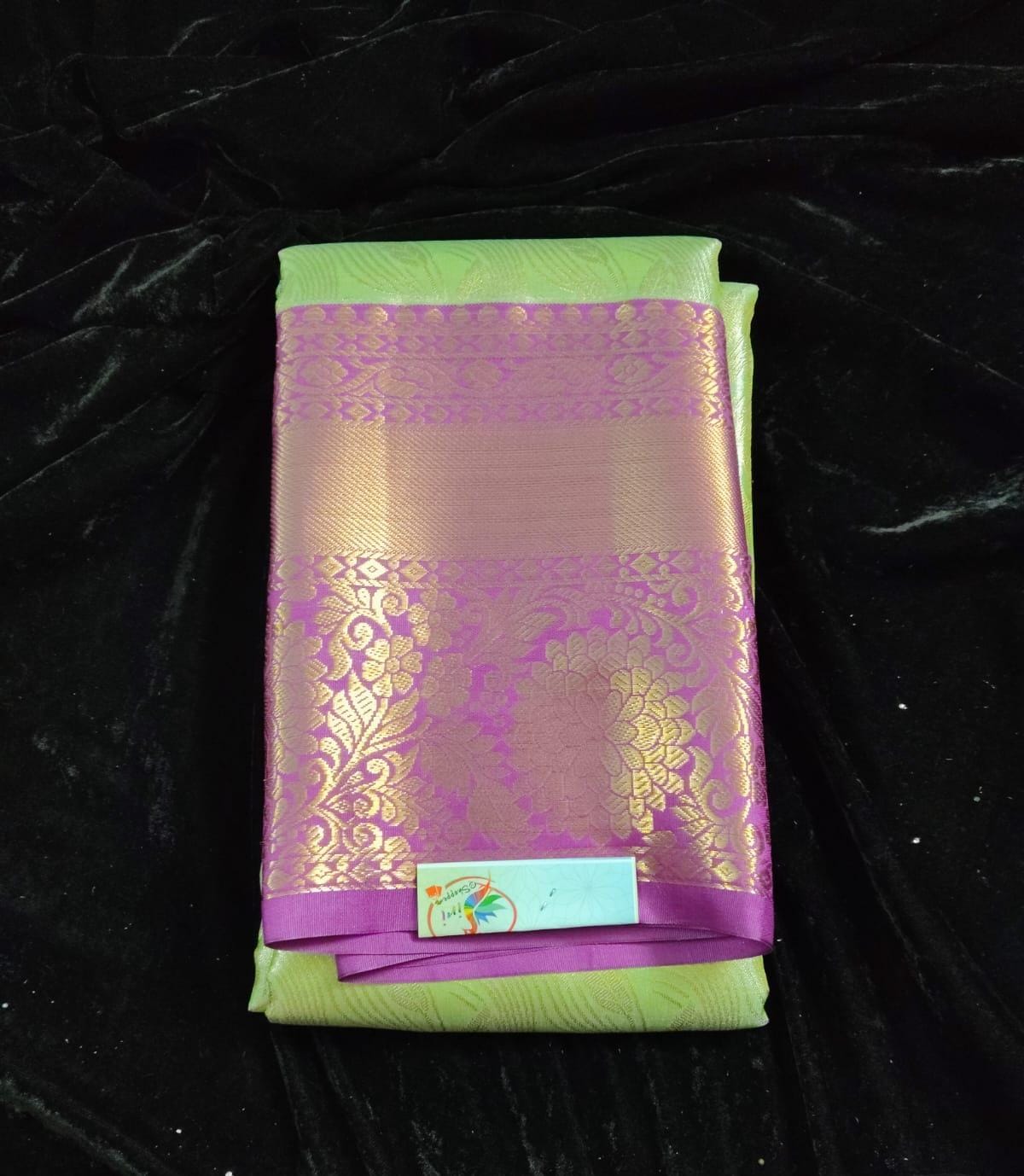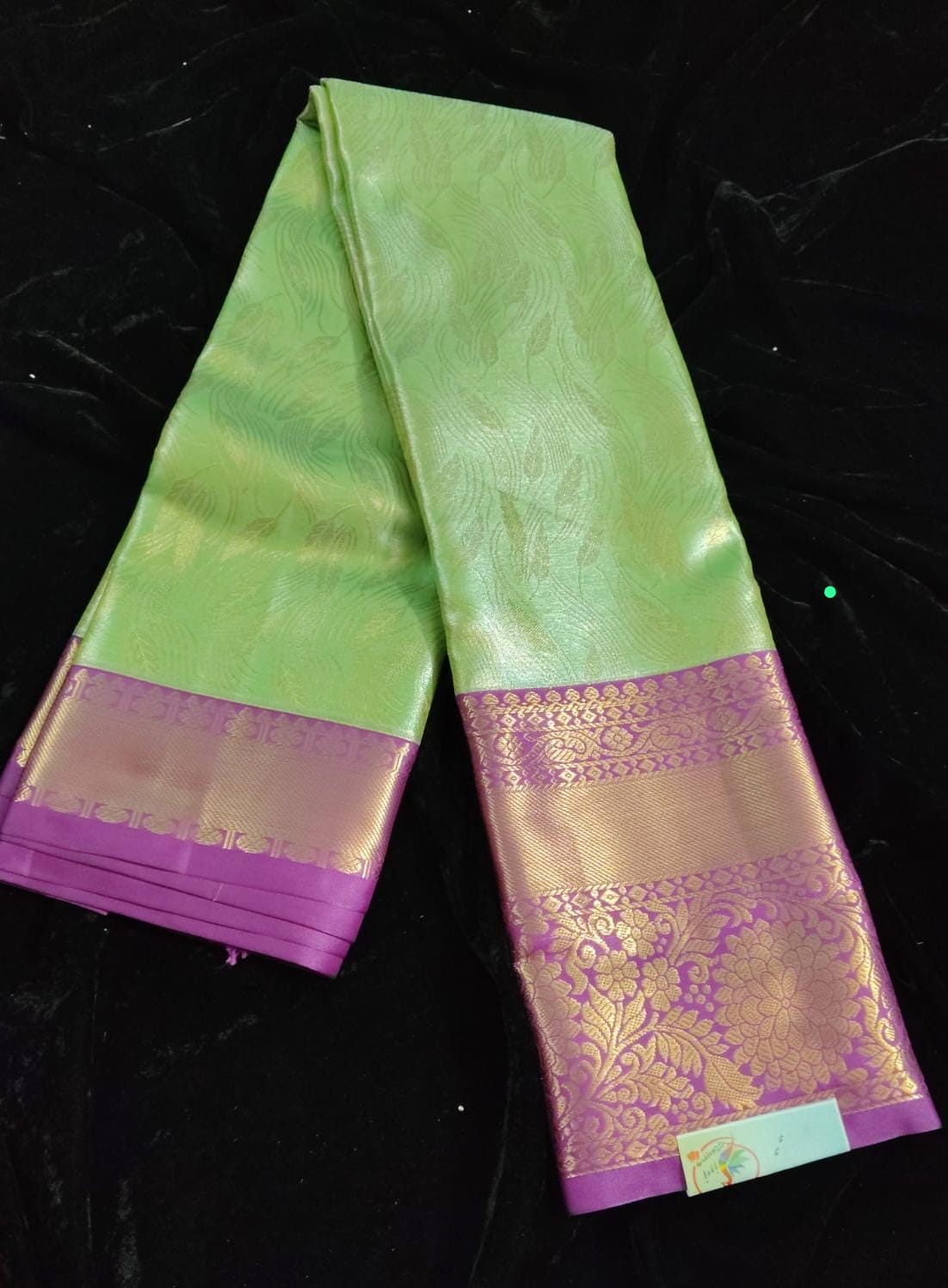 Green color Kanchipuram saree with gold Zari leaves pattern
