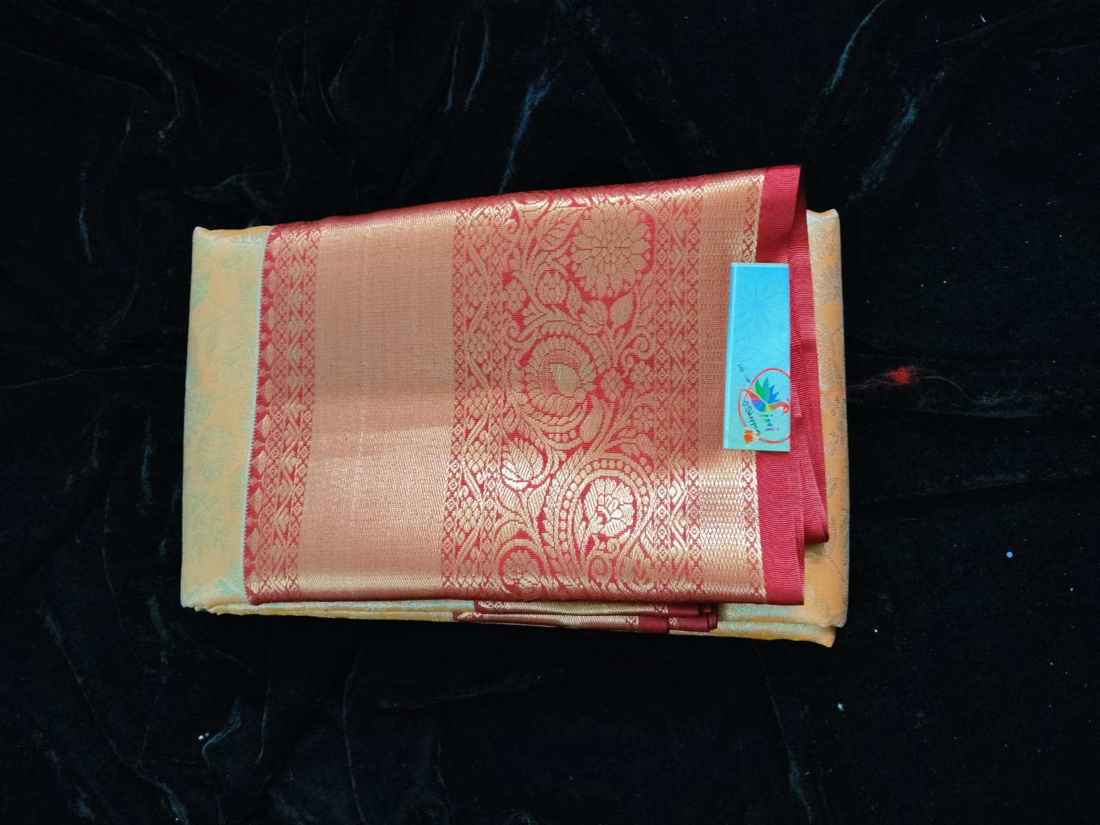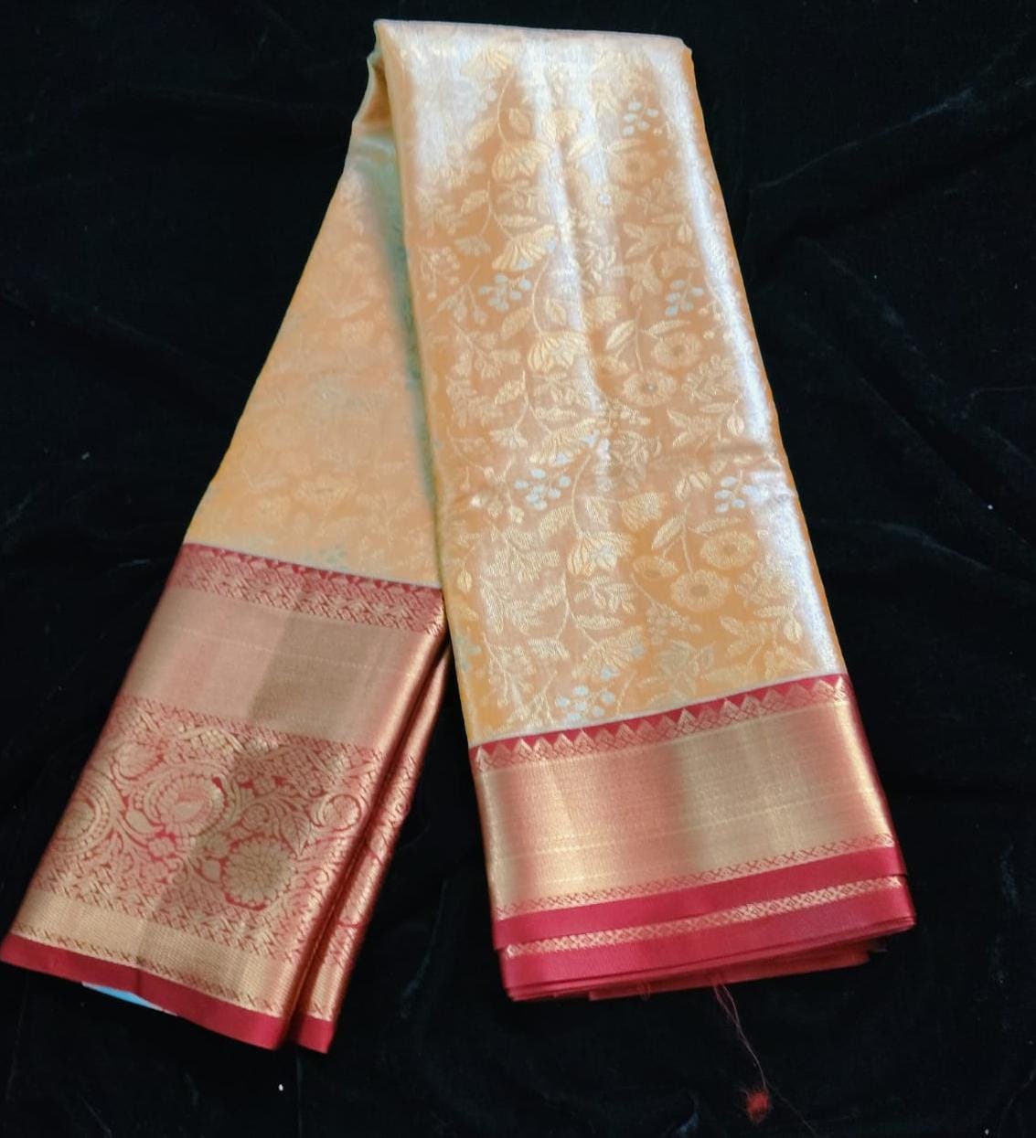 Sandal color Kanchipuram pattu saree with floral pattern and gold Zari work