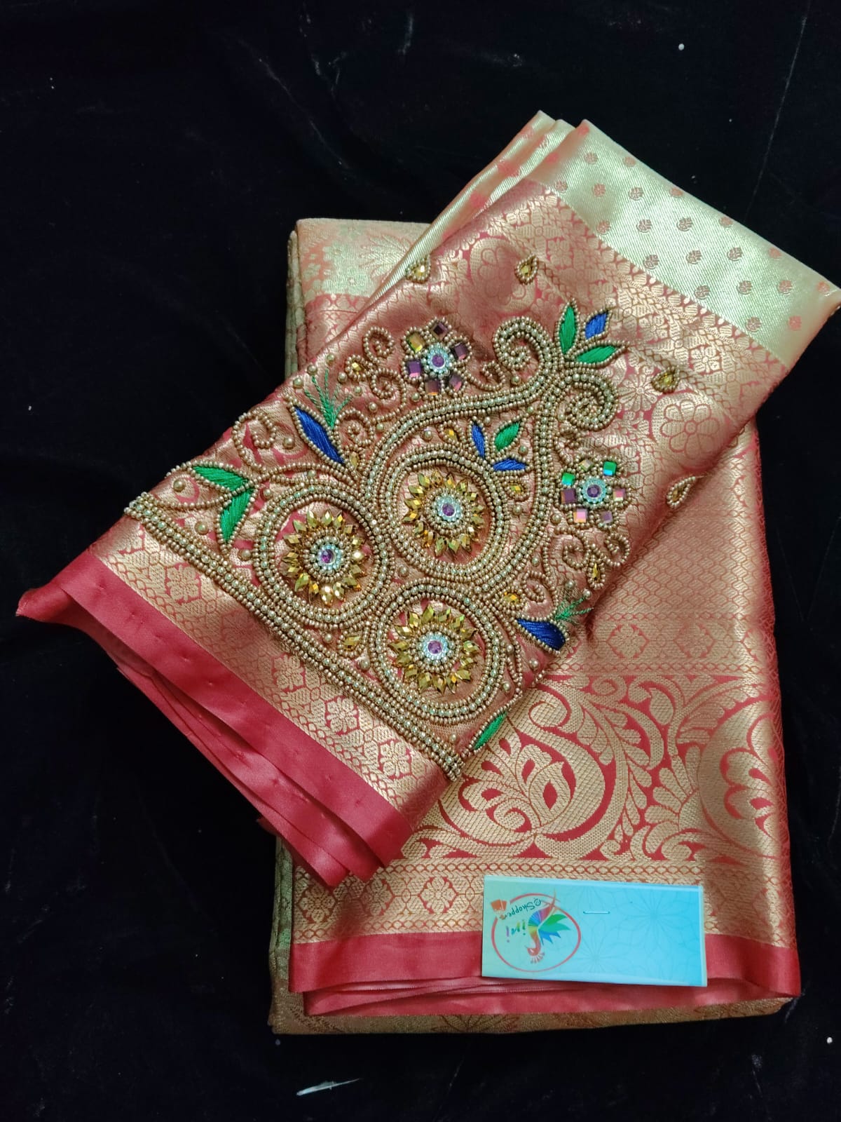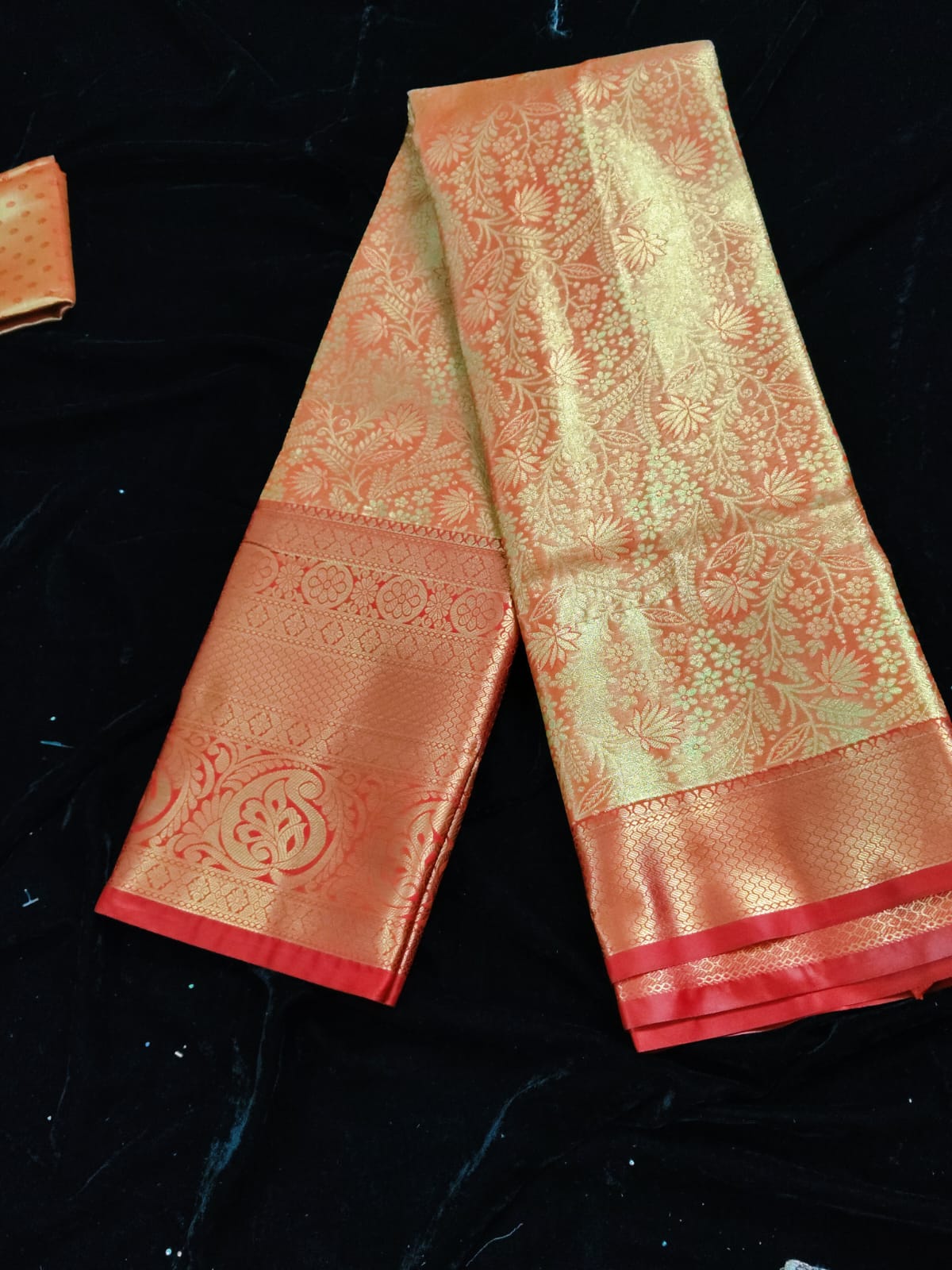 Orange color Kanchipuram pattu saree with floral pattern and gold Zari work