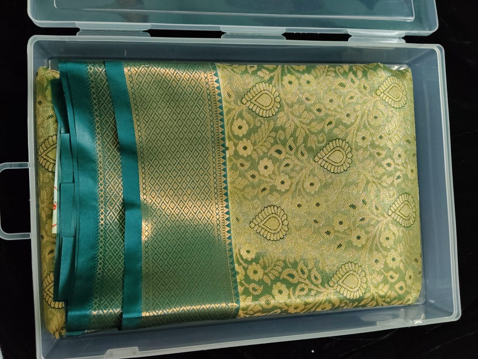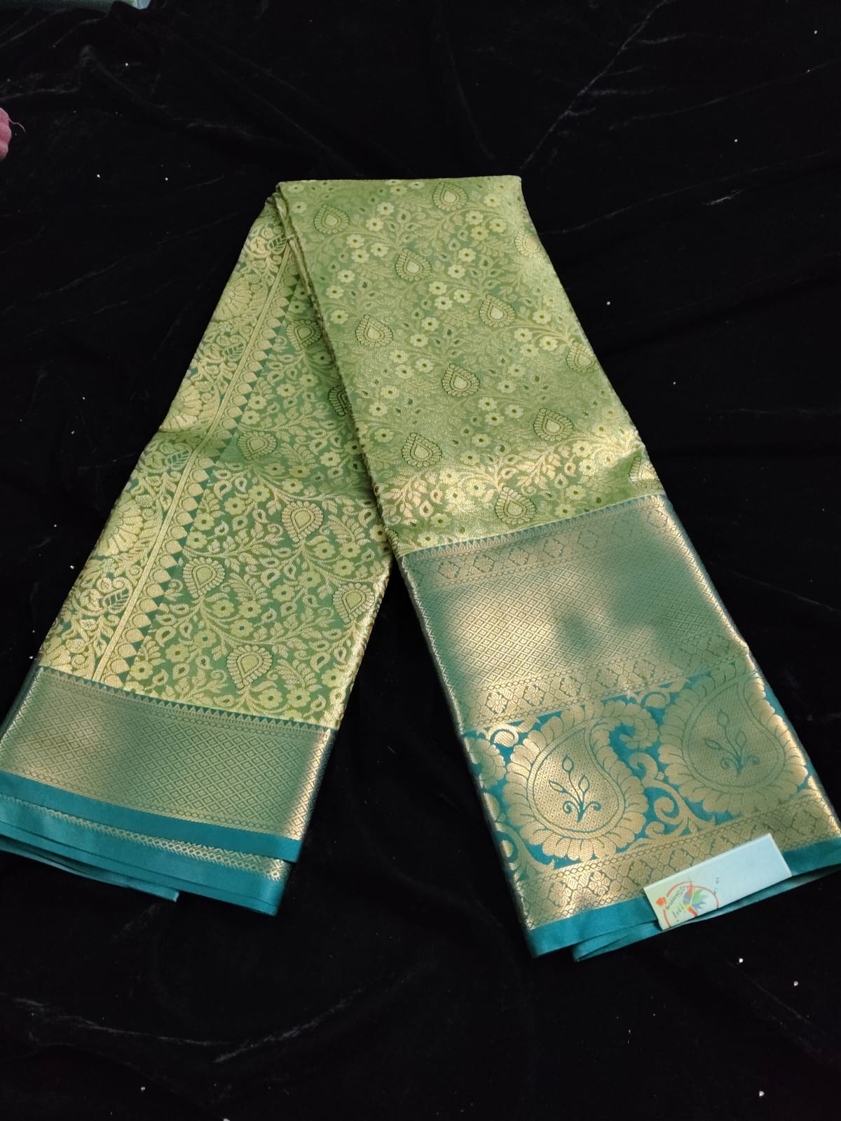 Green color Kanchipuram pattu saree with floral pattern and Zari work