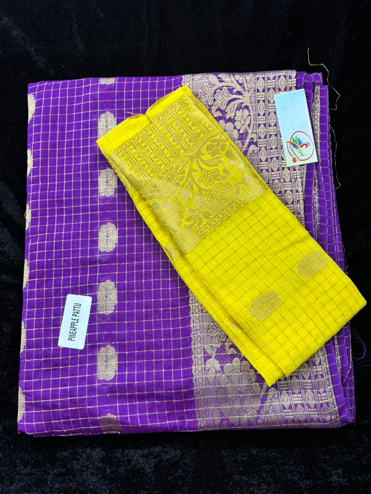 These sarees are pineapple pattu sarees with contrast color blouse, wide and intricately woven gold Zari border and a matching pallu