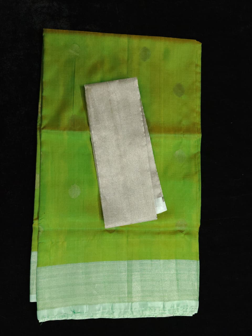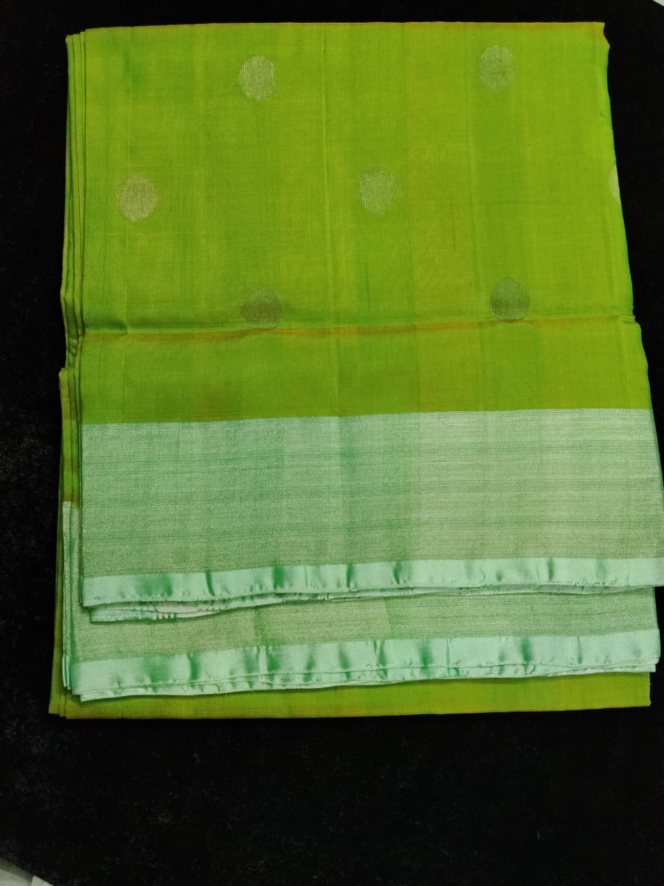 Green color Uppada pattu saree with gold dollar butta Zari work