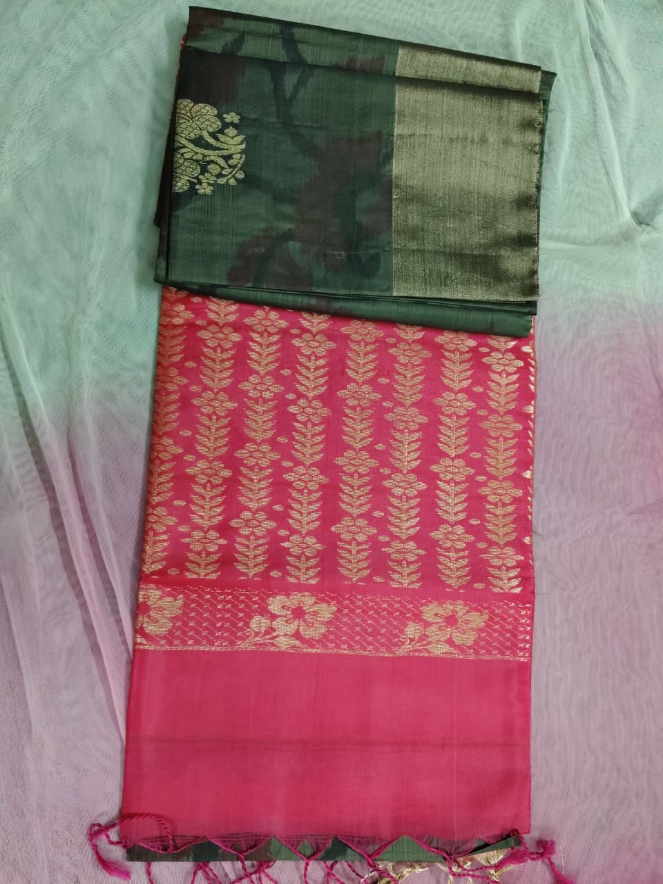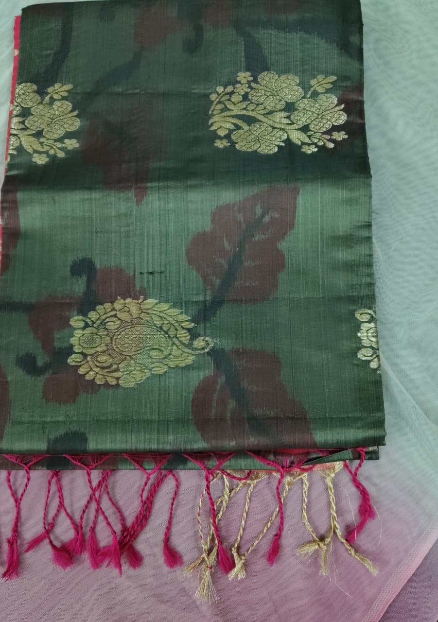 Thick Green uppada pattu saree with digital butta and pink color gold Zari pallu