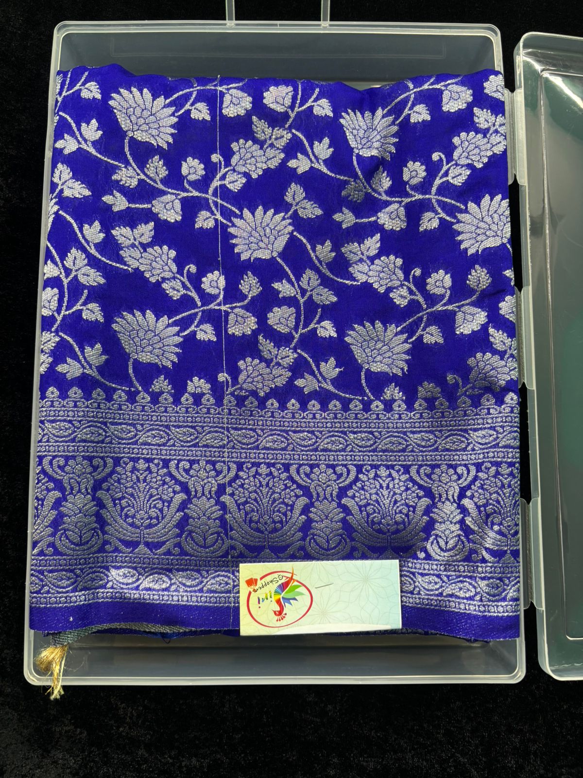 The fabric striking royal blue silk saree with intricate silver Zari weaving. Leading to grand pallu