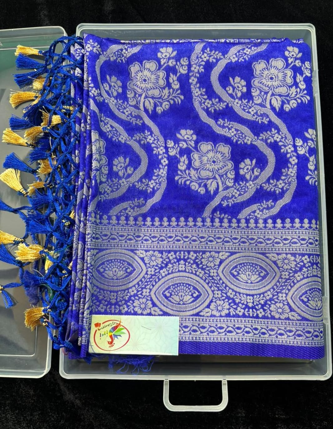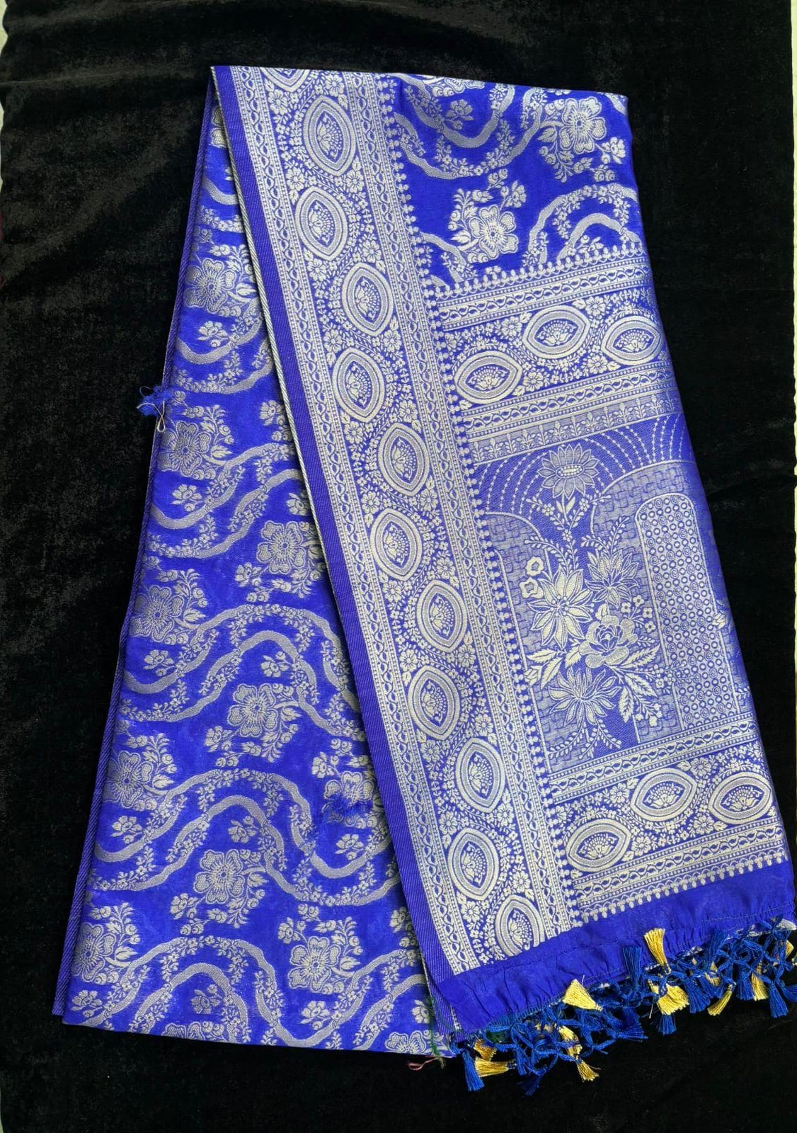 This is a royal blue saree intricately woven with stunning silver Zari floral brocade patterns and featuring a grand pallu