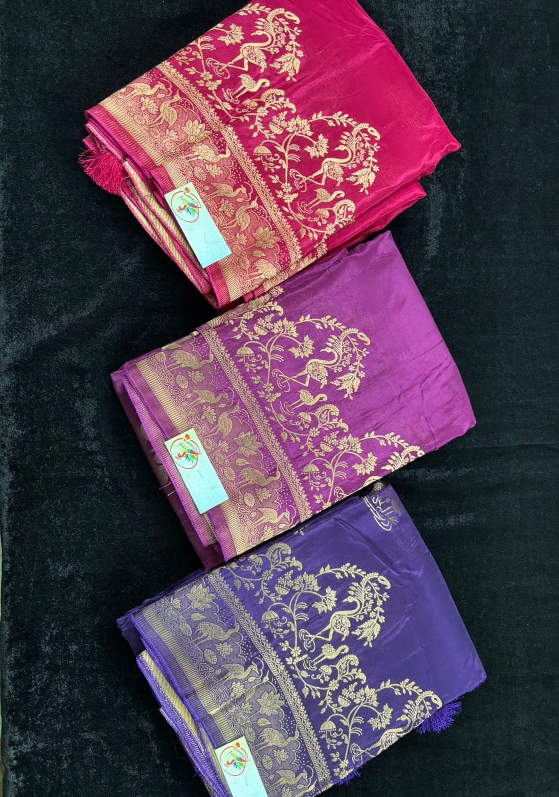 These are Kanjivaram sarees with golden Zari peacock and floral motifs along with border and pallu