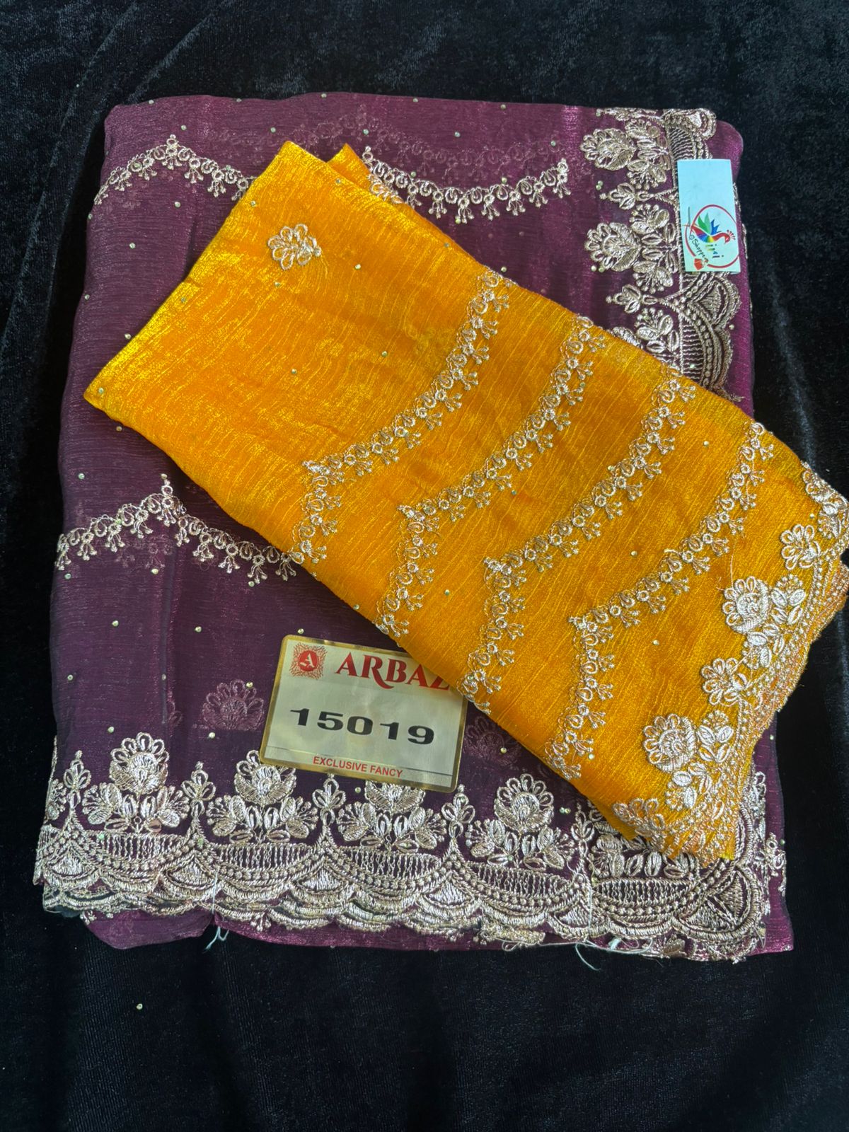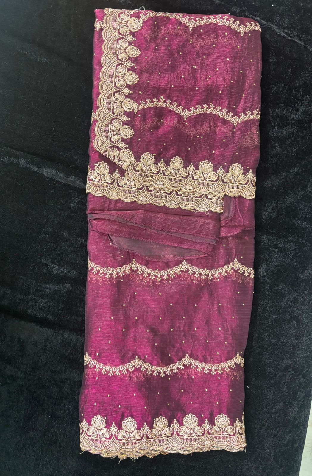 This is a designer saree with golden embroidered scallop borders and contrast blouse