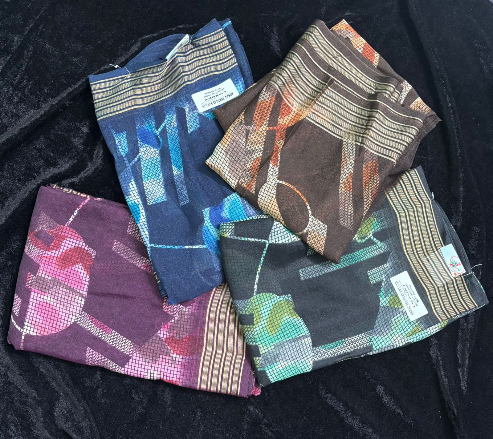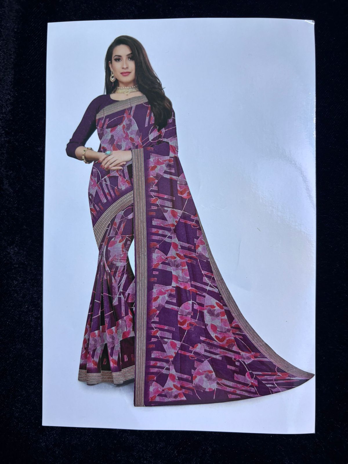 These sarees are lightweight, synthetic sarees with a sheer layer and geometric patterns