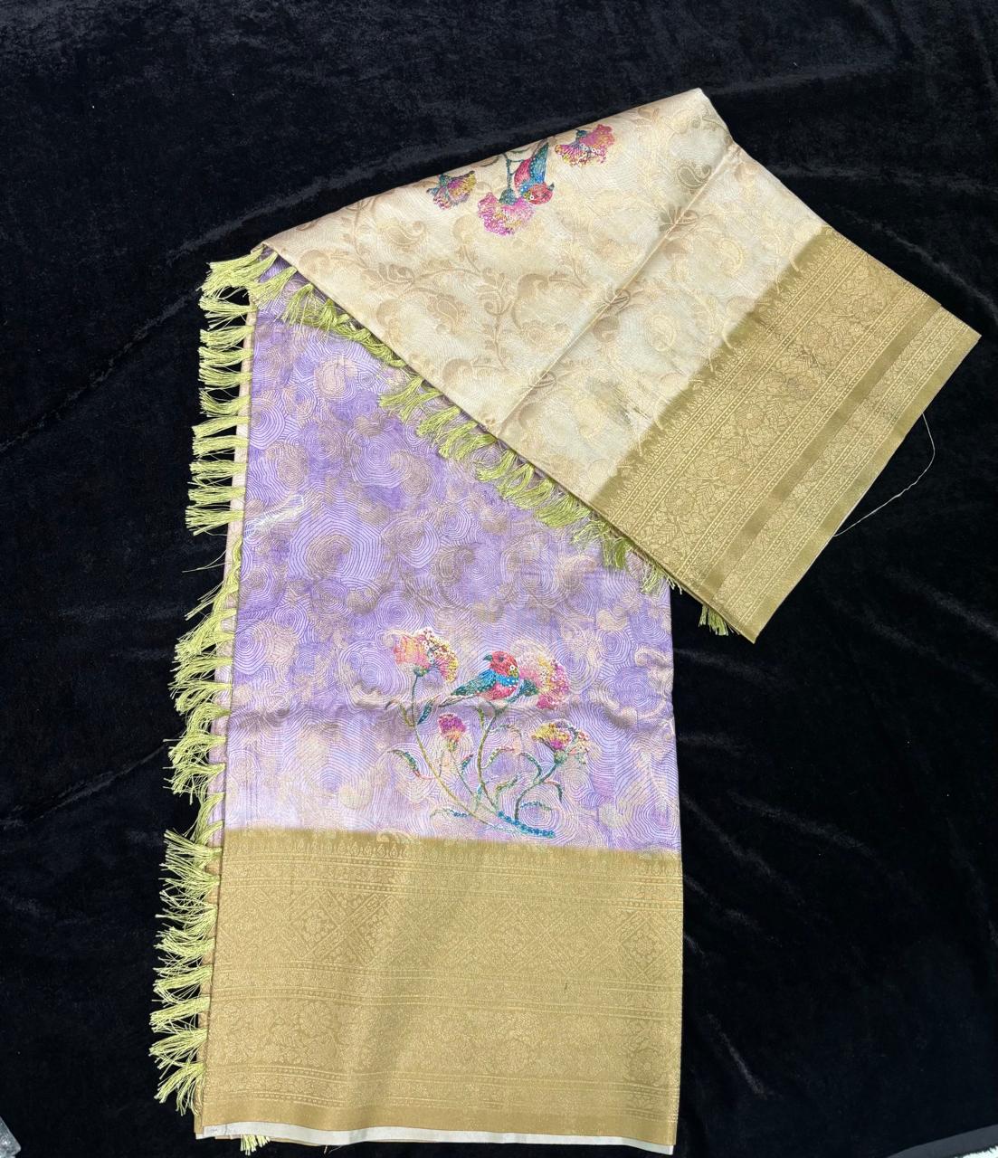 This is a lavender Kanjivaram silk saree with Zari weaving