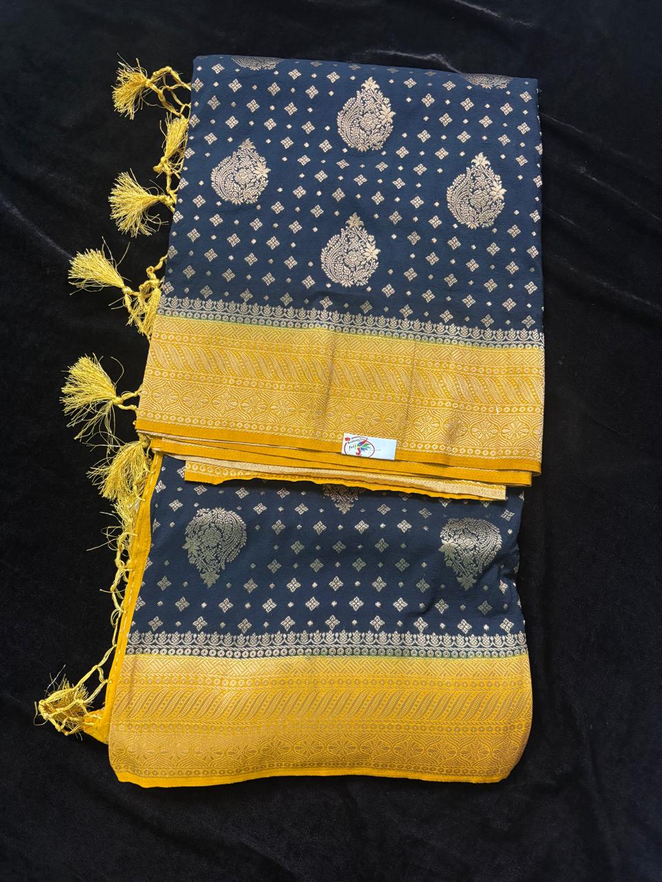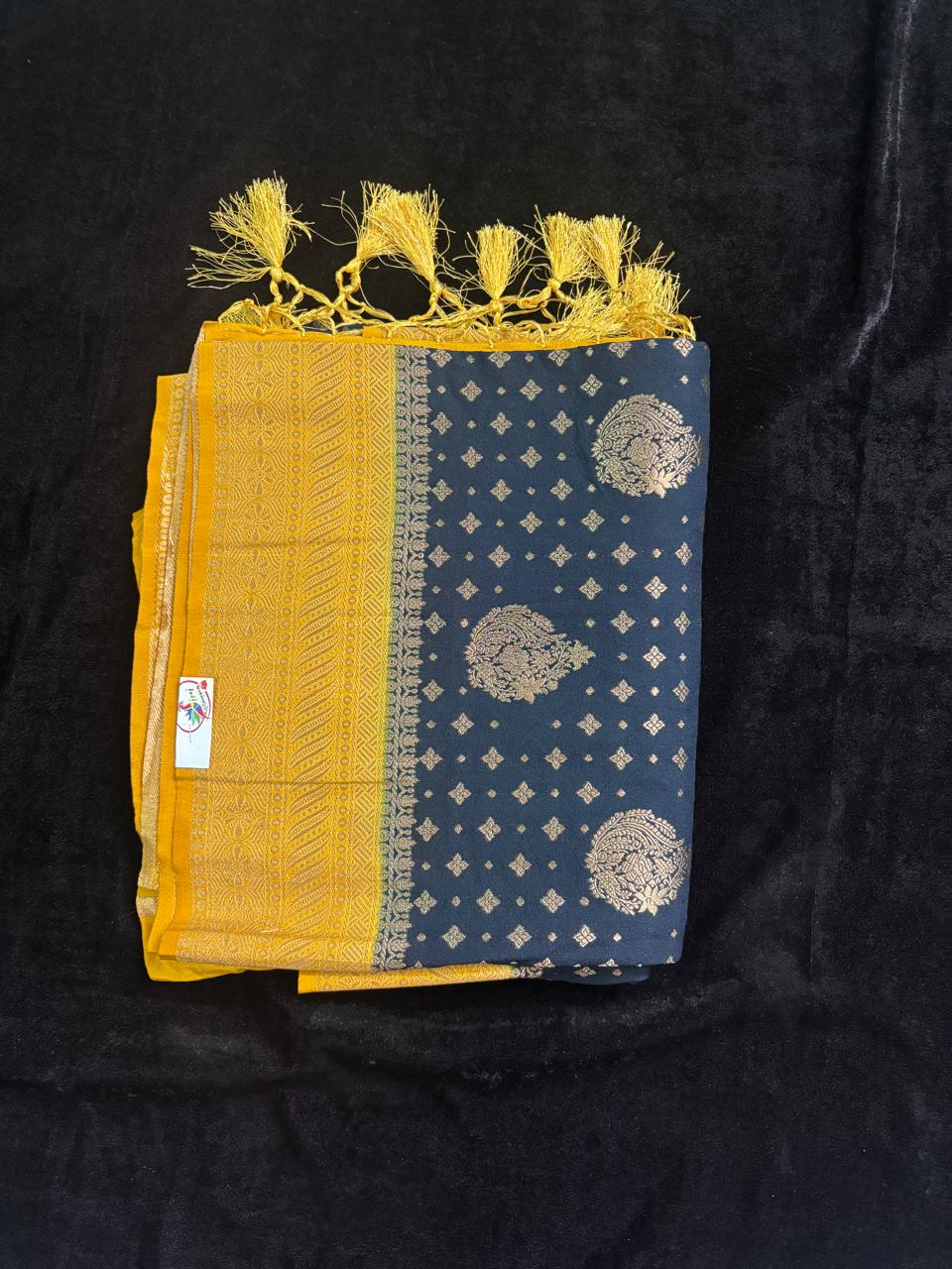This saree features a rich navy blue base adorned with golden motifs, complemented by a striking golden border and intricate pallu