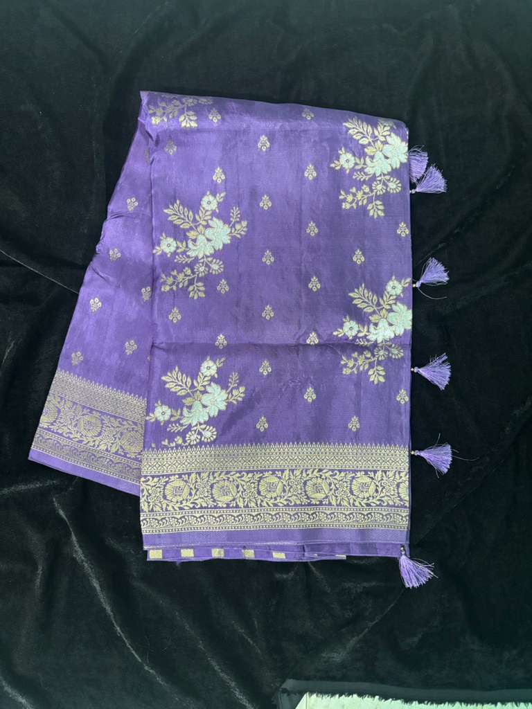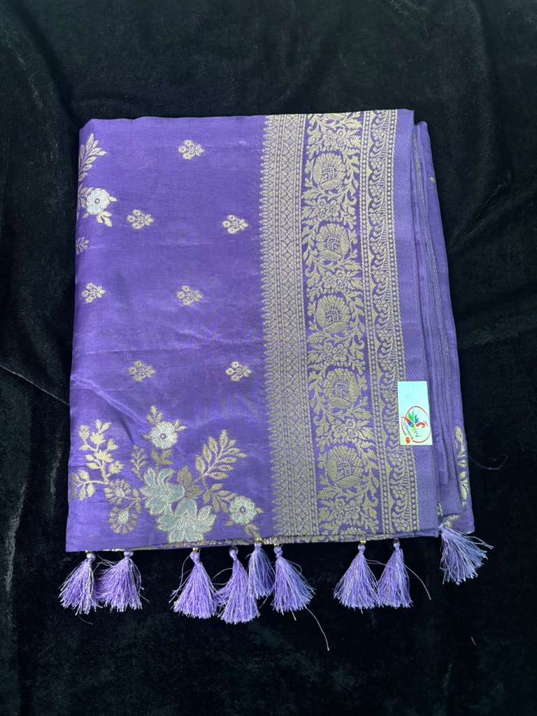 Banarasi silk saree with intricate gold floral motifs and a rich golden Zari border