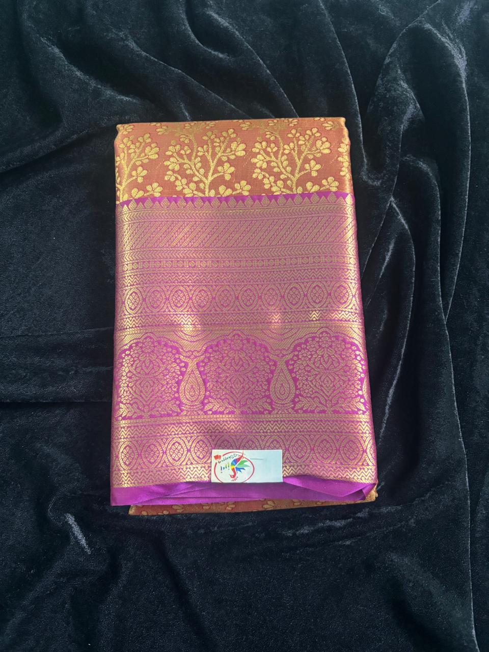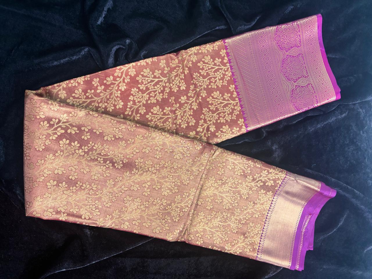 This is a Banaras saree featuring a pink and gold floral design with intricate zari work and contrasting pallu