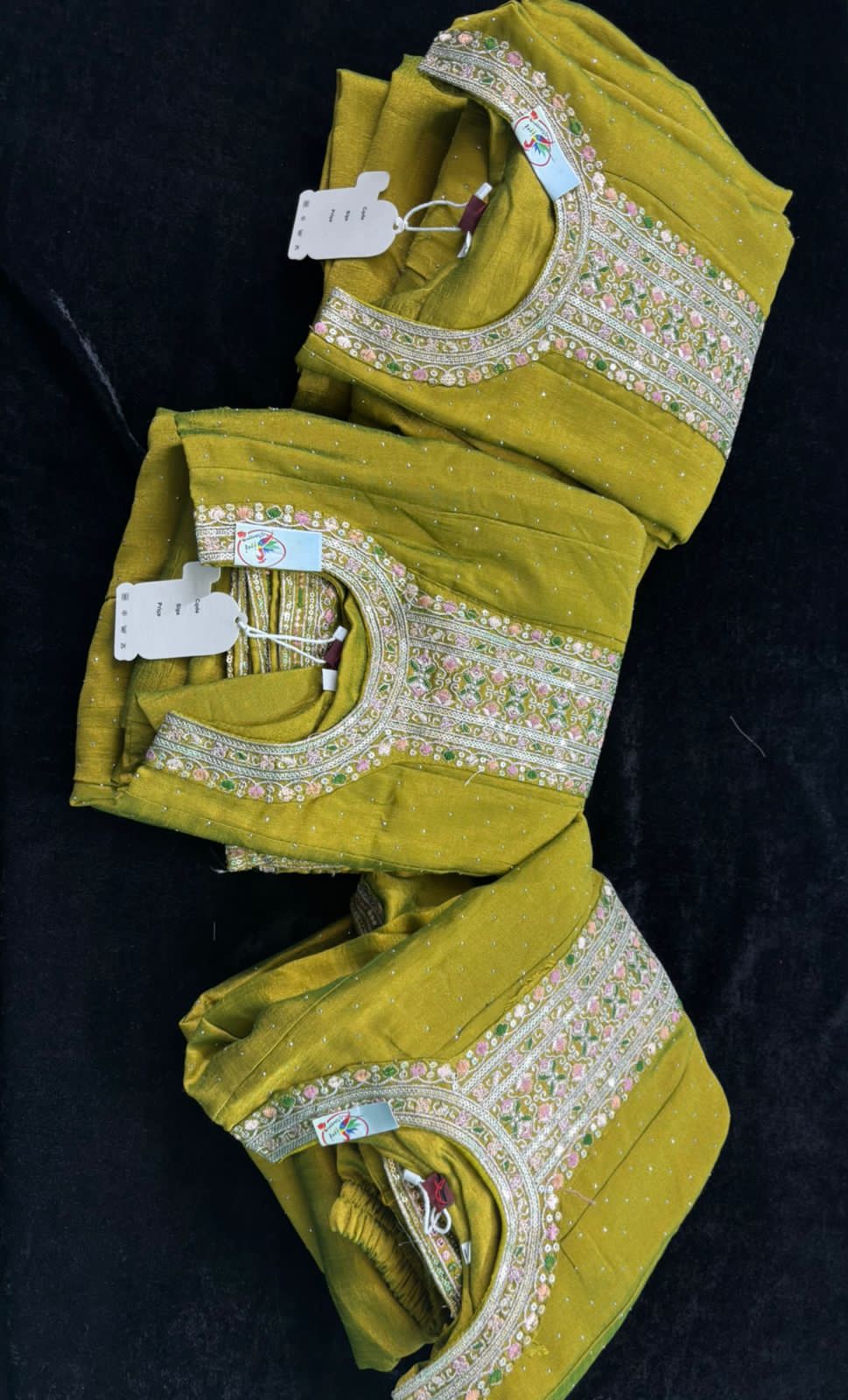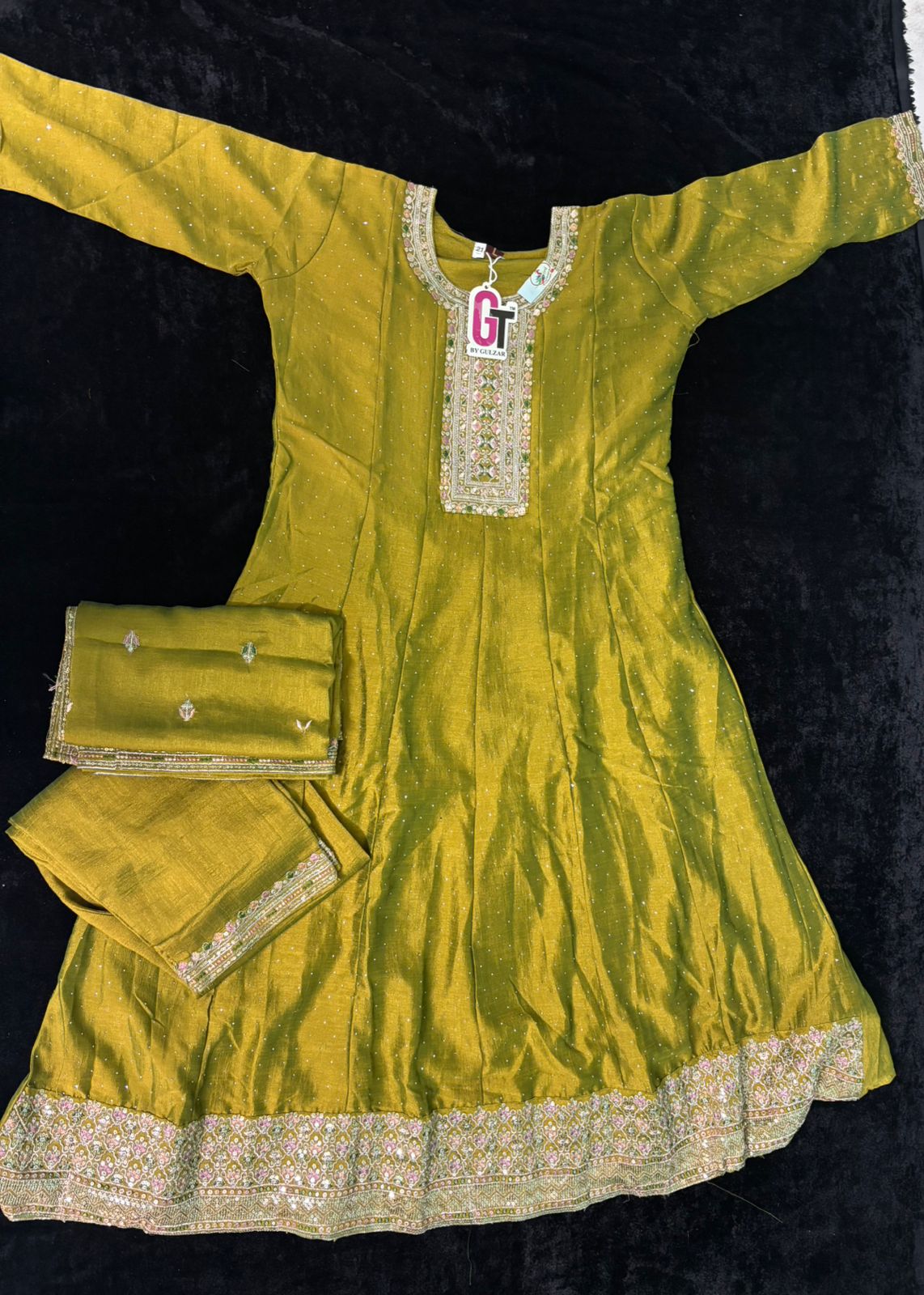 Olive green silk Anarkali suit with embroidery work. Available in L, XL, XXL