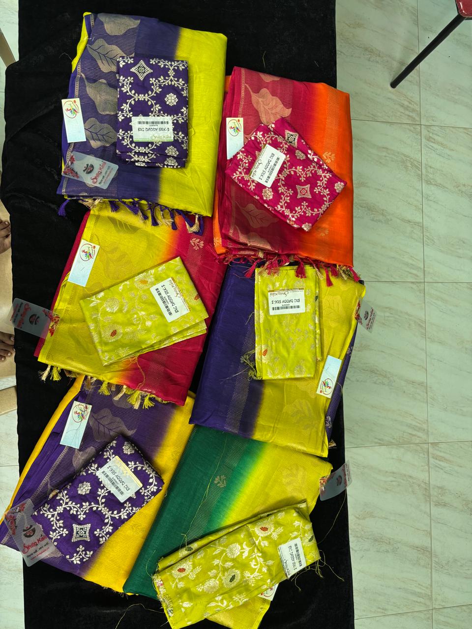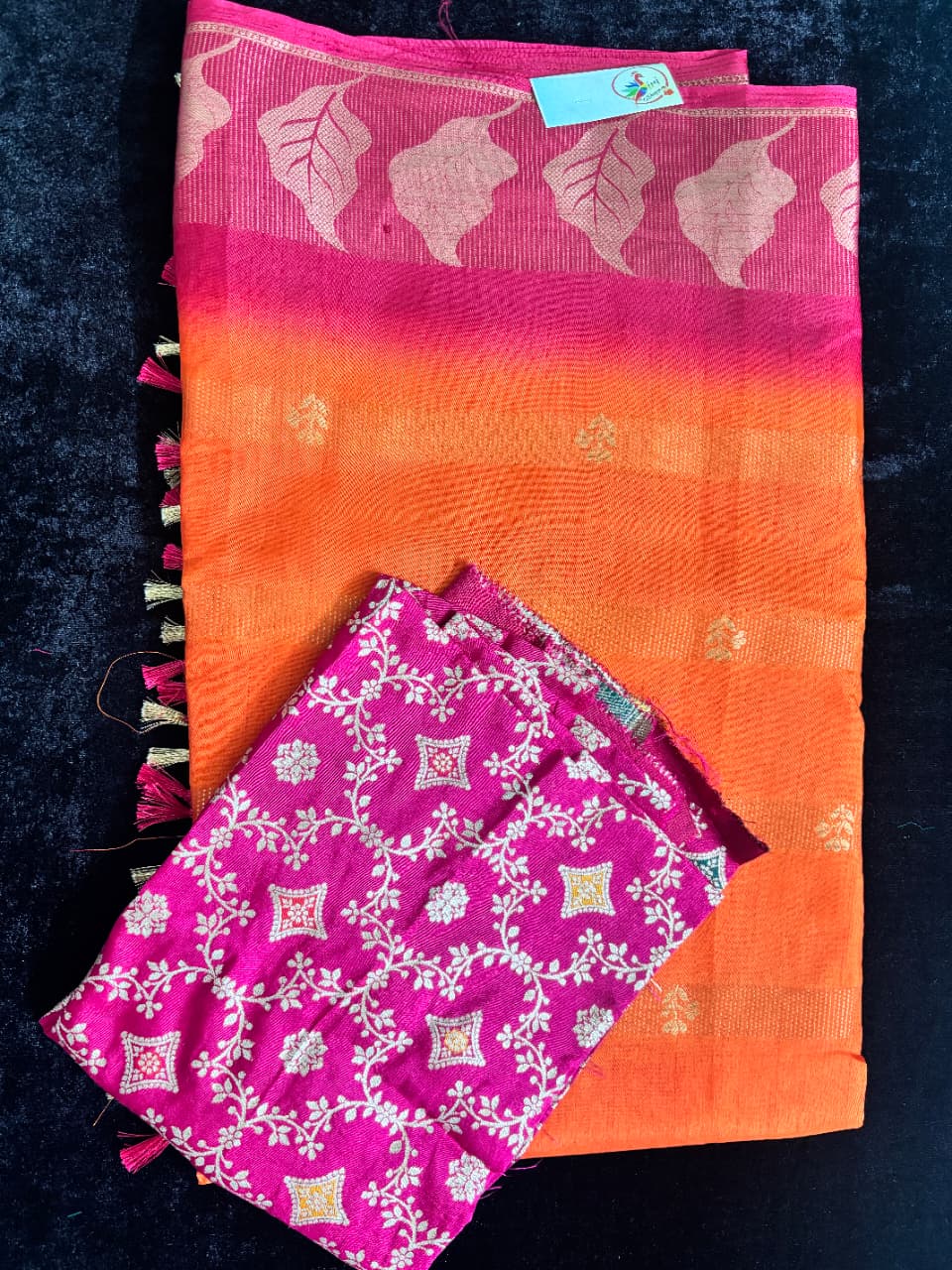 This is a Banarasi silk saree with a gradient of orange and pink, featuring a woven leaf pattern on the broder