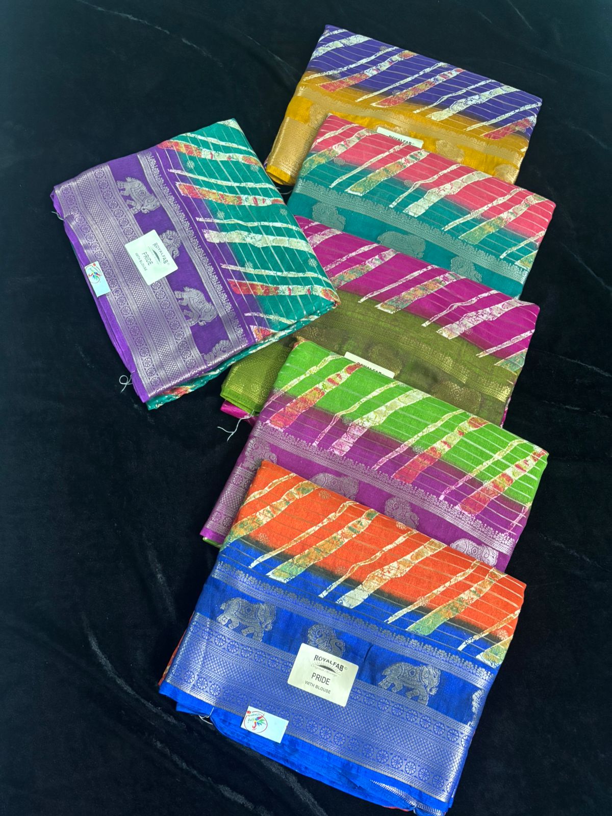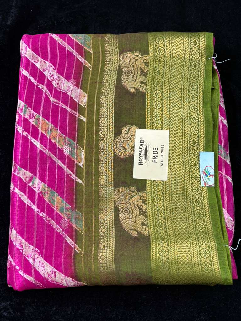 The saree has a prominent magenta with golden and lighted pink stripped pattern the borders are wide olive green color with intricate pattern with floral motifs