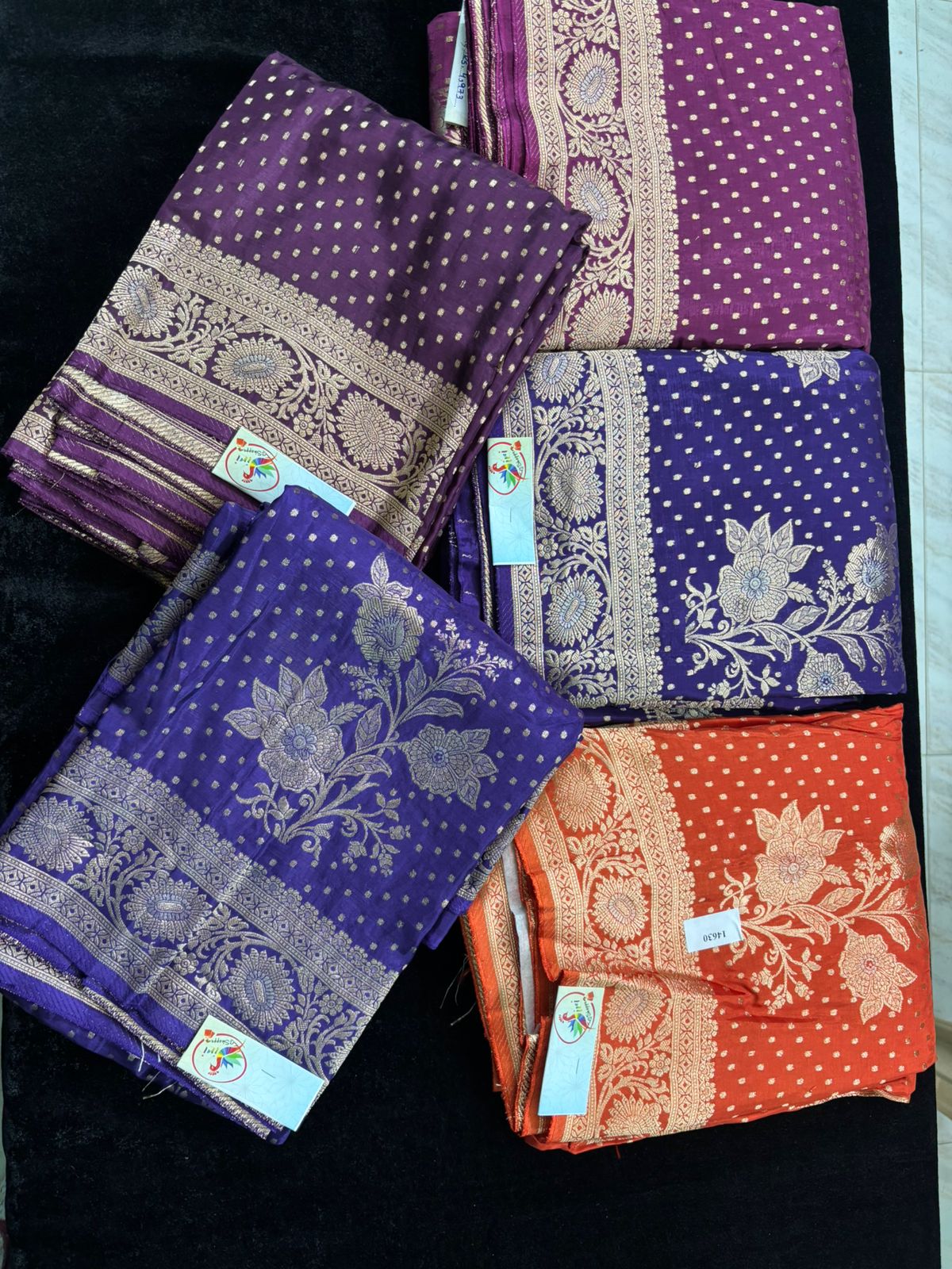 The sarees are Banarasi silk intricate patterns created with gold Zari work include floral motifs