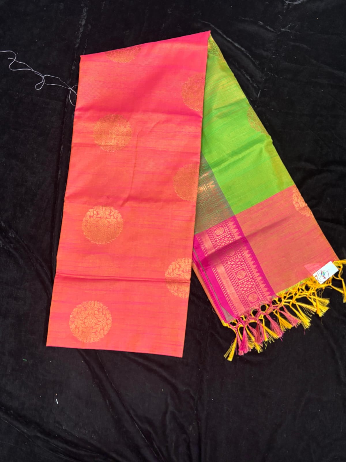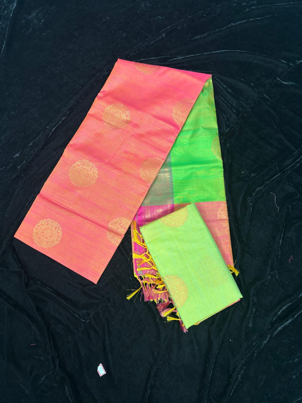 Name : Banana pith Material : pattu Fabric : Soft Design type : Glod Zari flower design Pallu : contrast pallu Blouse : Green color running blouse