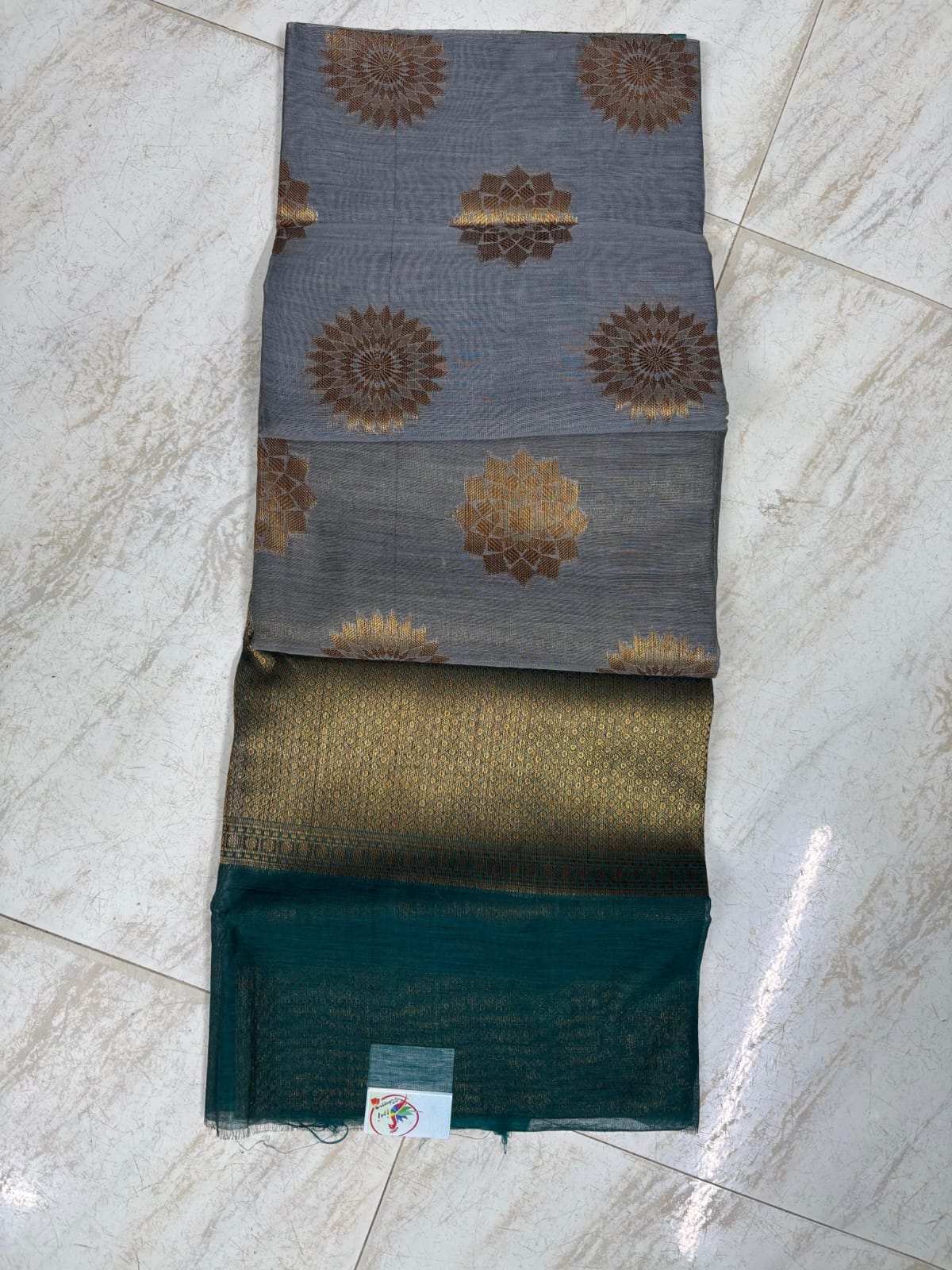 Name : Banaras Kanchi Tissue Material : Tissue Fabric : Cotton Tissue Design Type : Gold Zari flower work Pallu : Self with Contrast Pallu Blouse : Contrast color as pallu with Gold Zari work