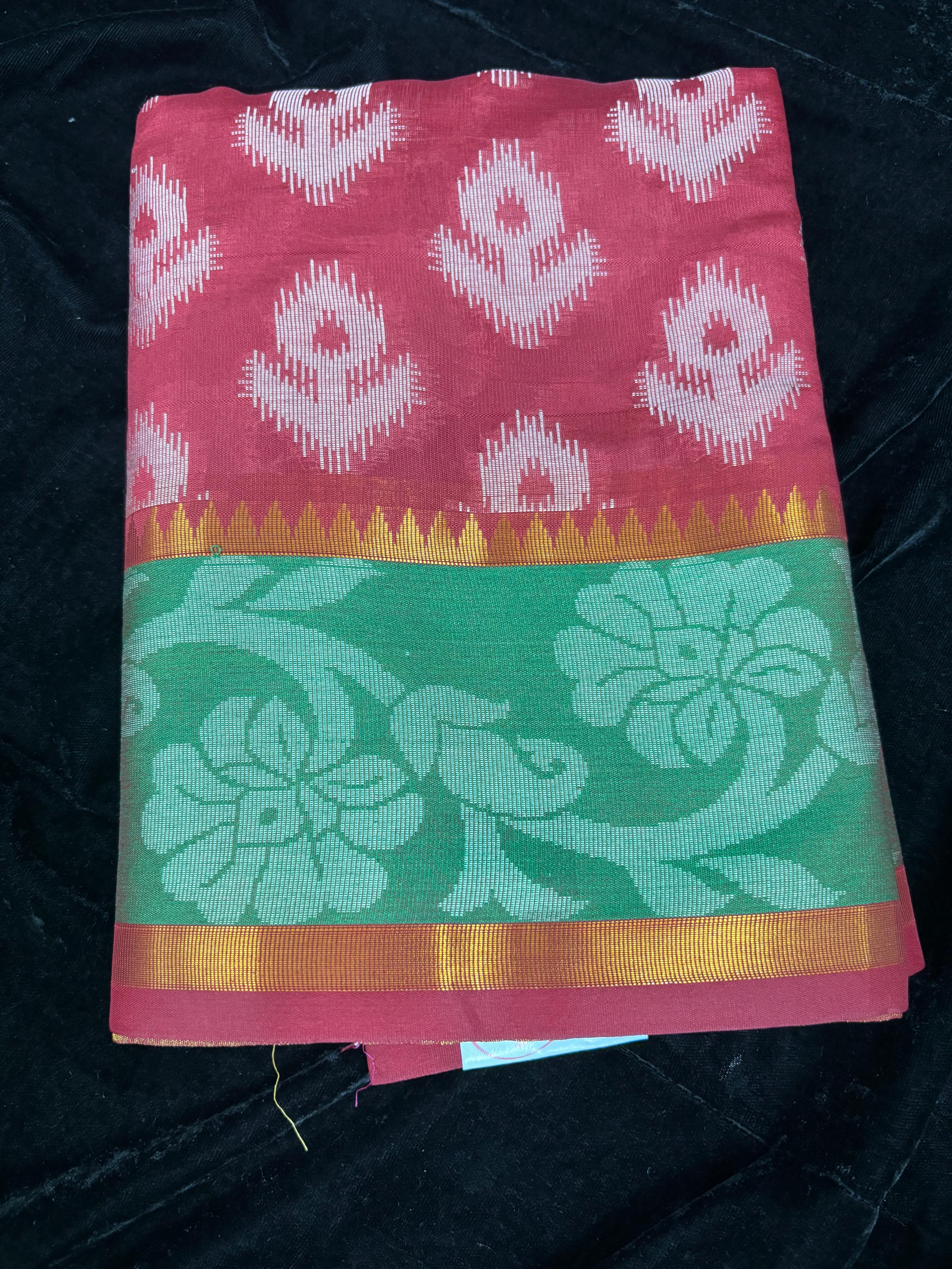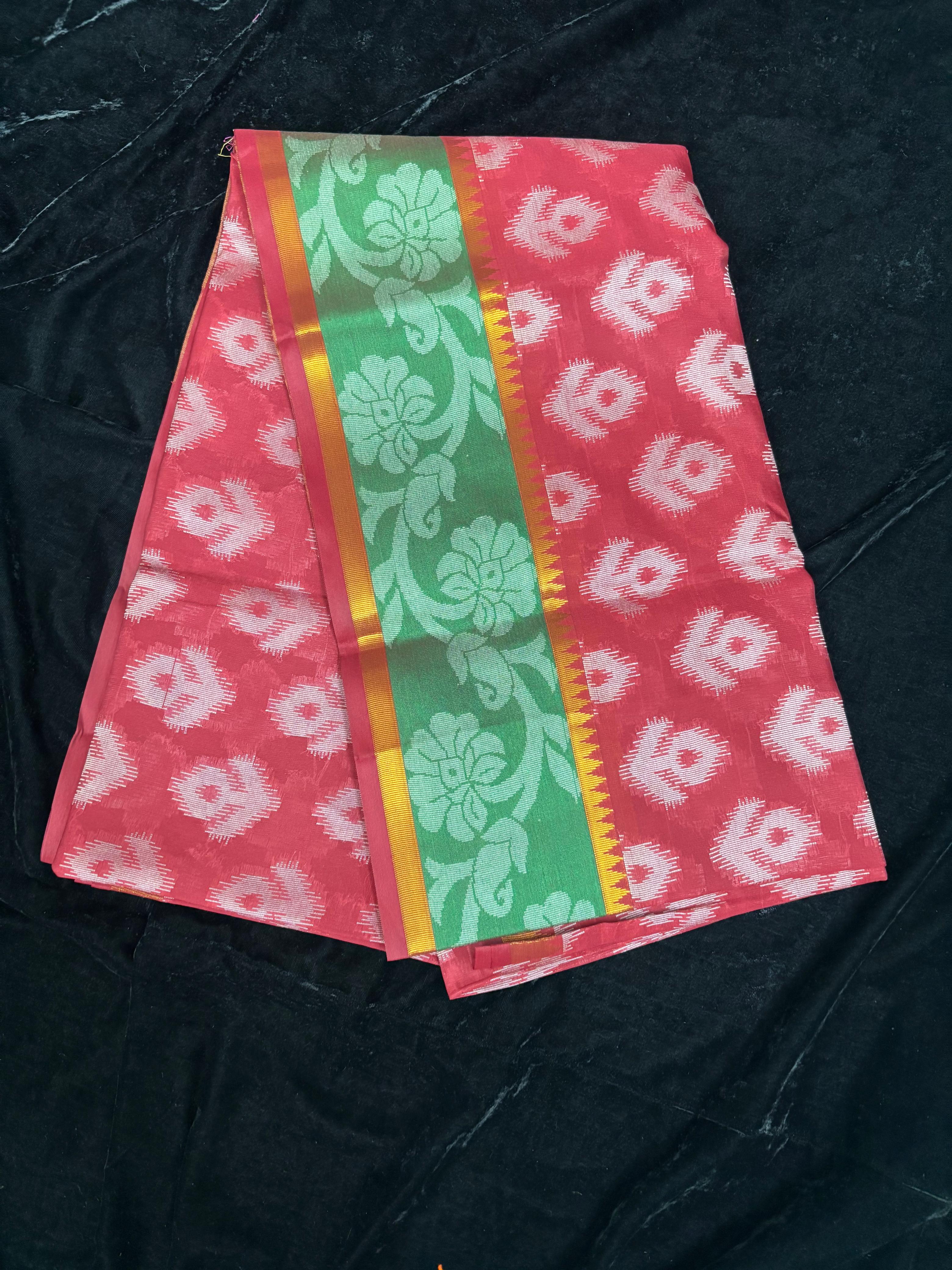 Name : Ikkat silk Material : silk fabric : Soft Design : Printed brocade design Pallu : Self with contrast color border Blouse : Self running blouse