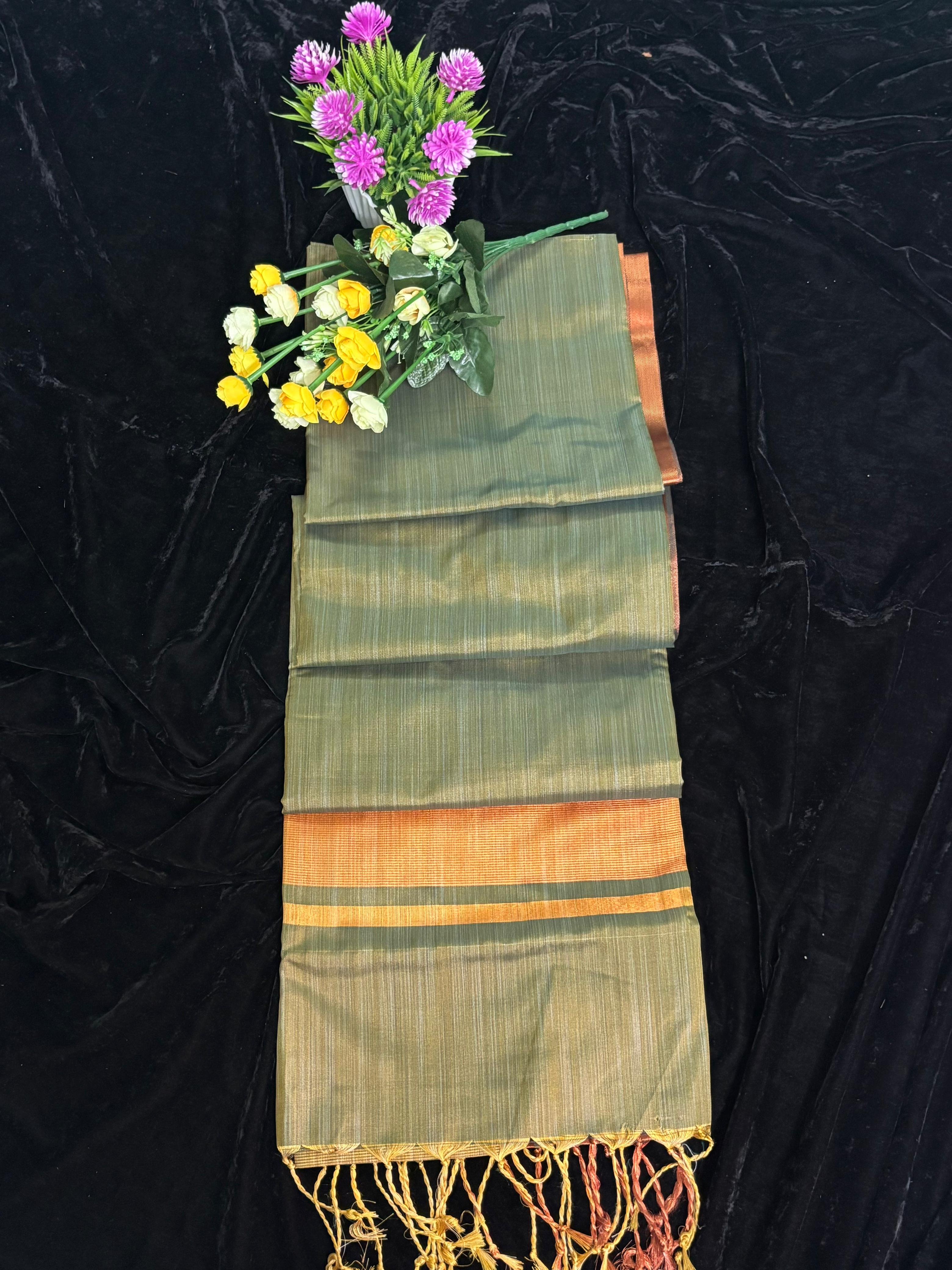 Name : Maheshwari silk Material : Silk Fabric : Soft Design : Plain with gold zari Pallu : Self with contrast Blouse : Self with Gold border
