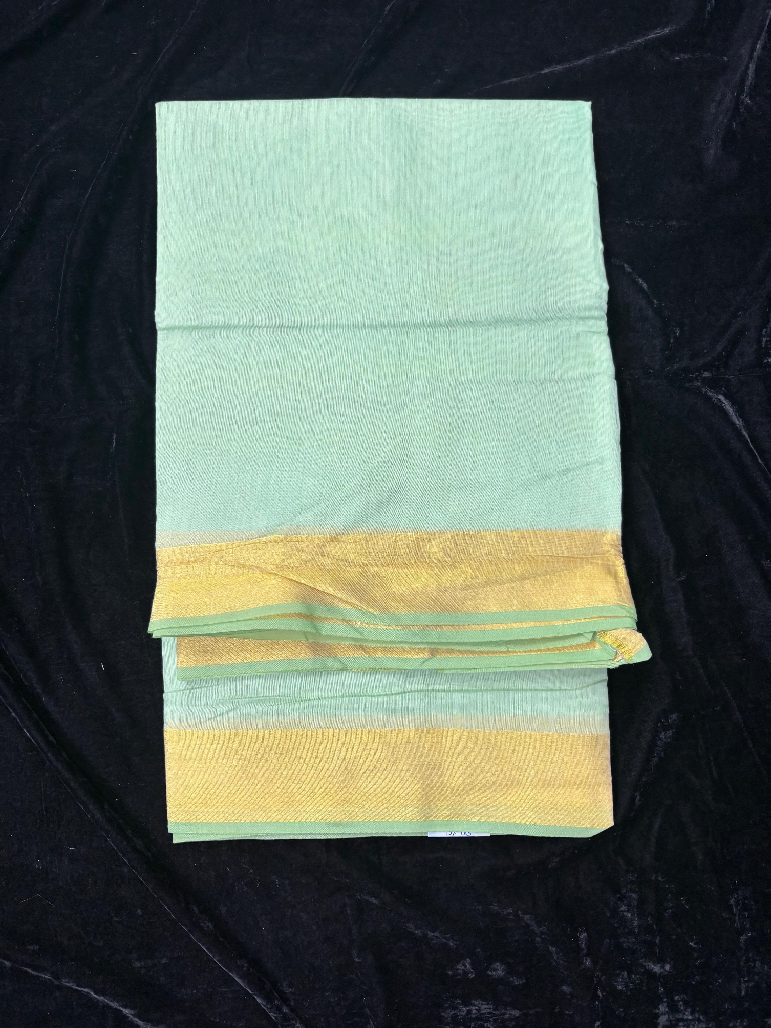 Name : Katta Doria Material : cotton Fabric : Soft Design : Palin with gold zari border Pallu : Self Blouse : Plain self running blouse
