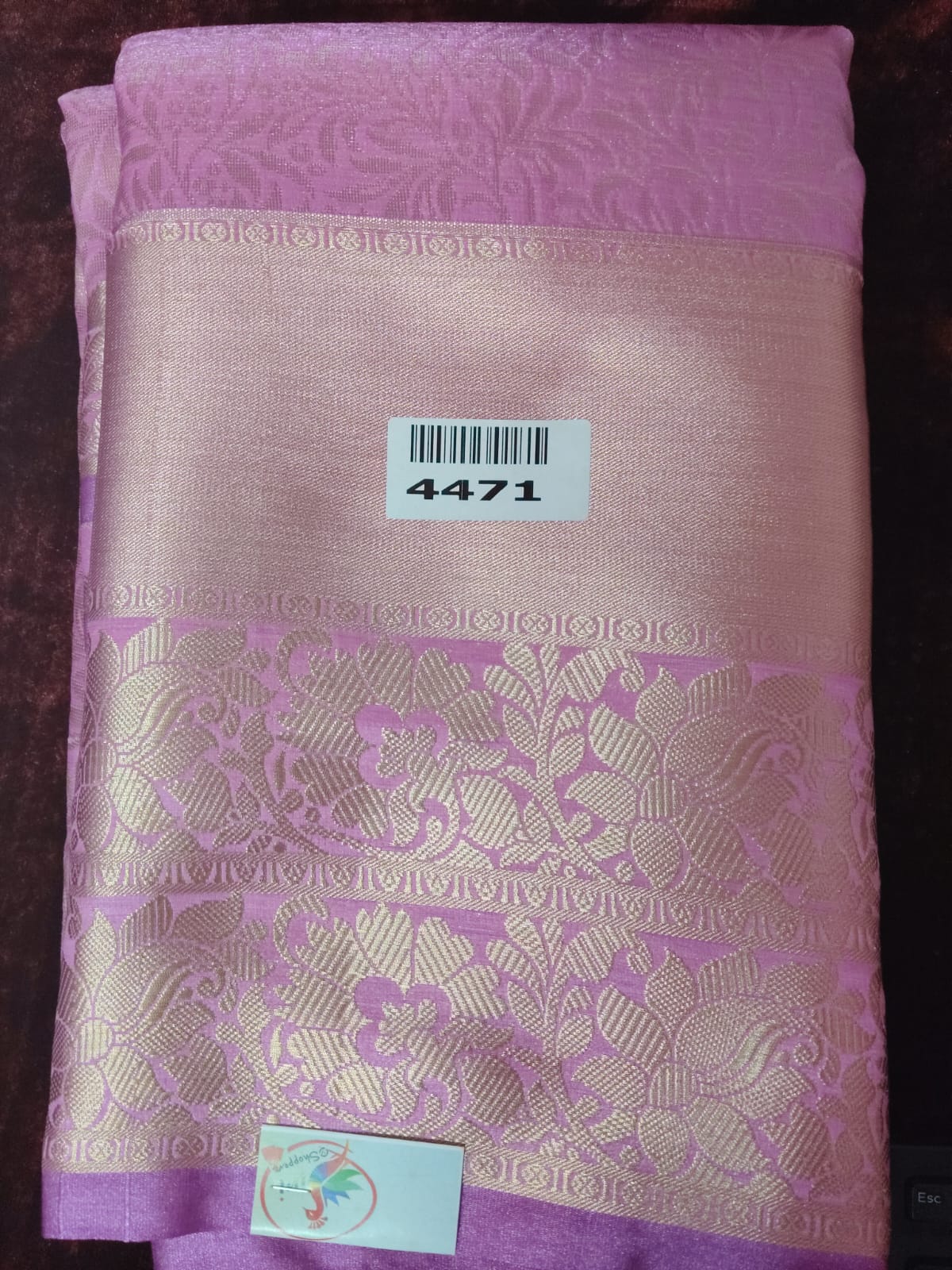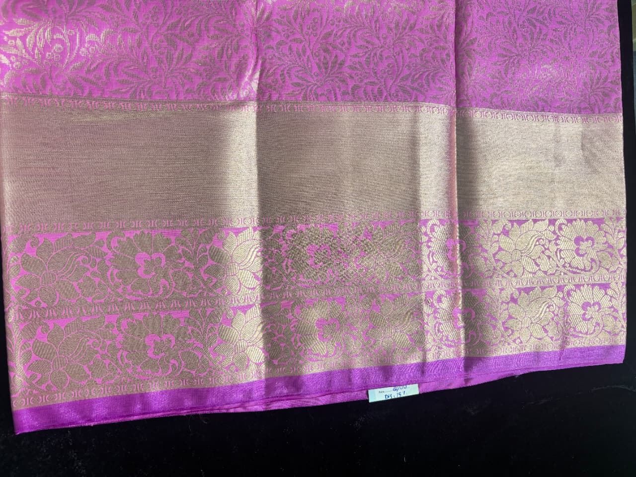Kanjivaram Pink and lavender, purple color saree with gold border with floral pattern likely Zari work
