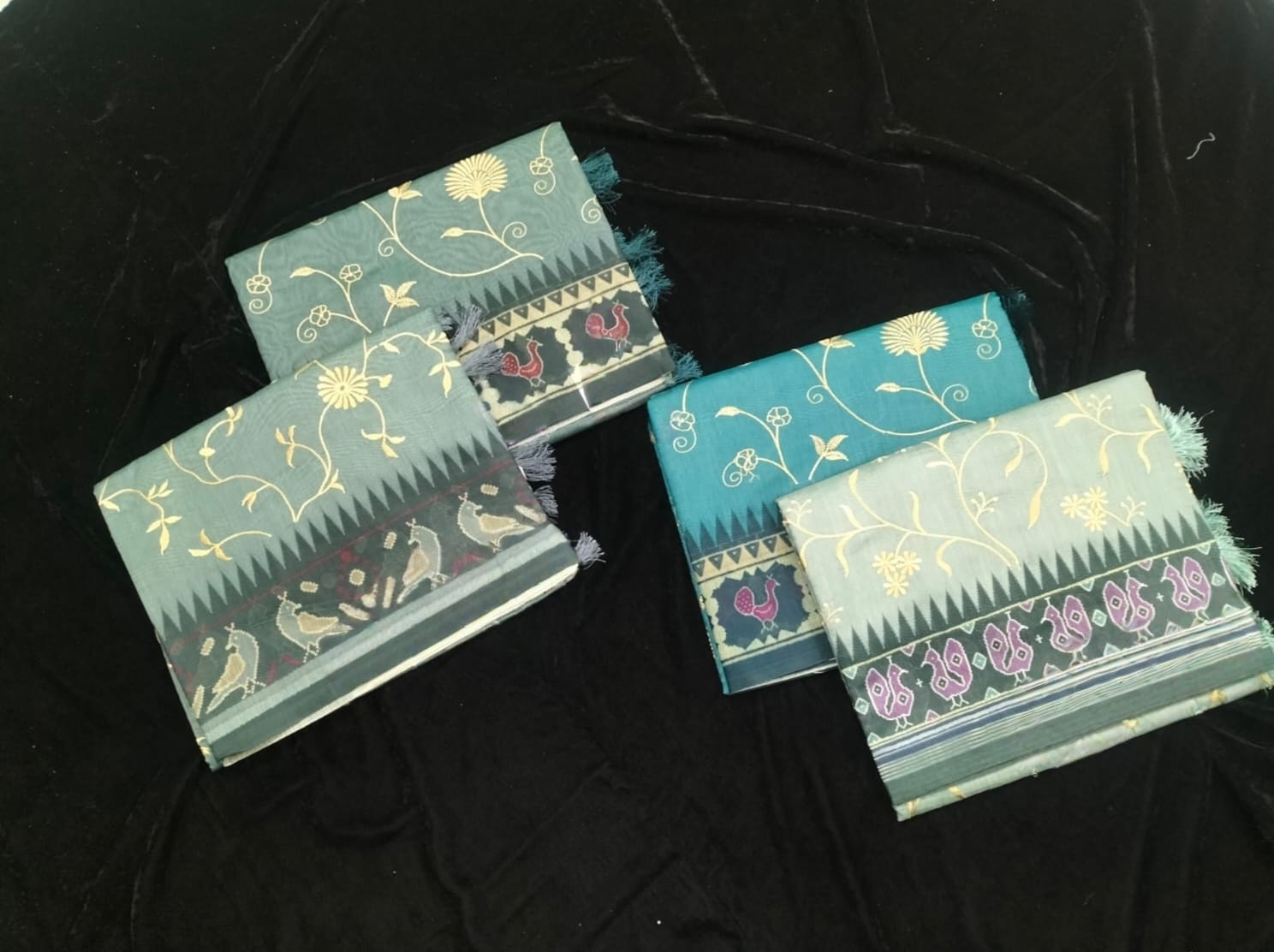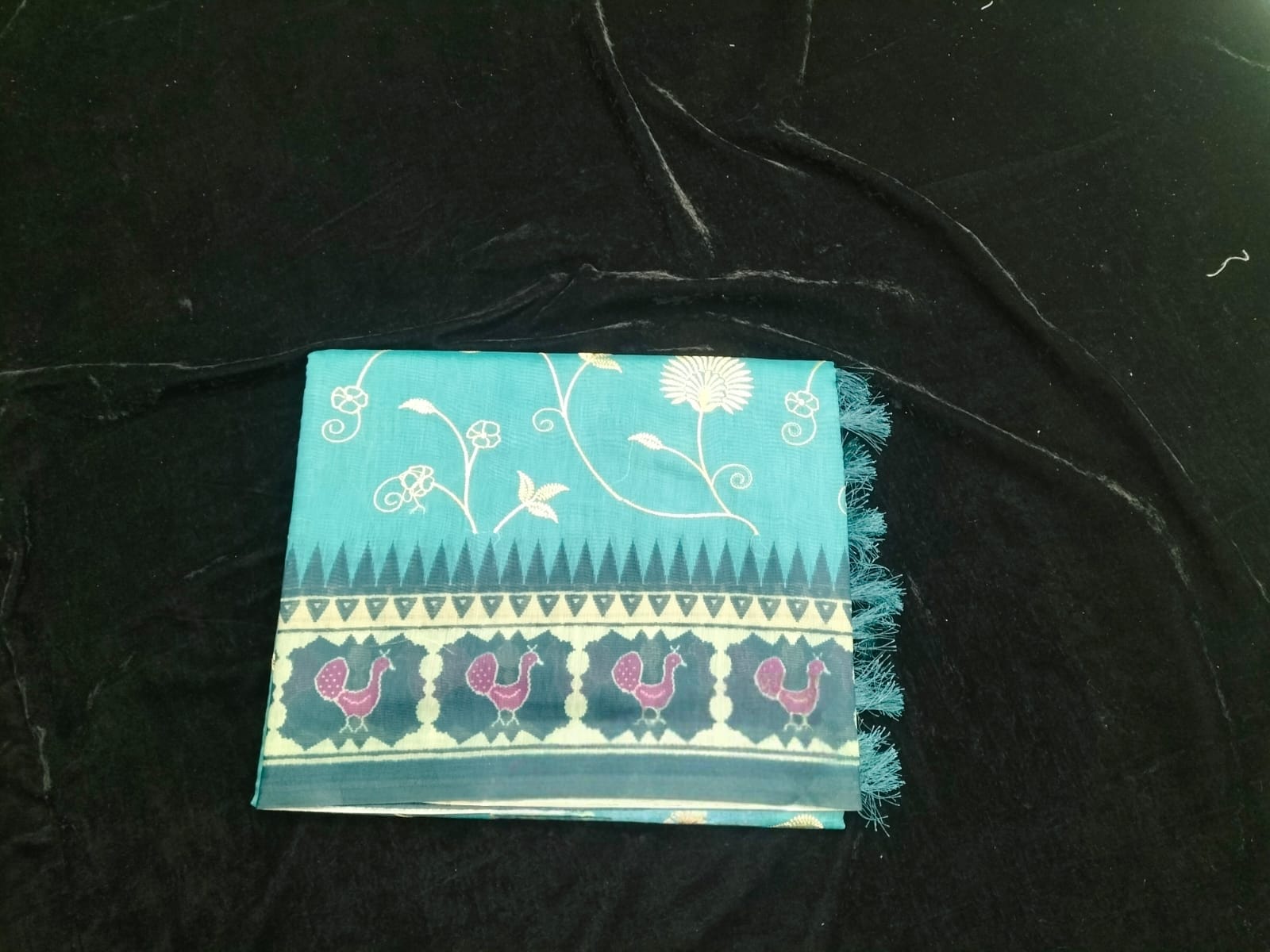 Name : Pochampally Ikkat Lenin Material : Cotton Fabric : Lenin Design : Embroidery and printed design Pallu : Self blouse : Self