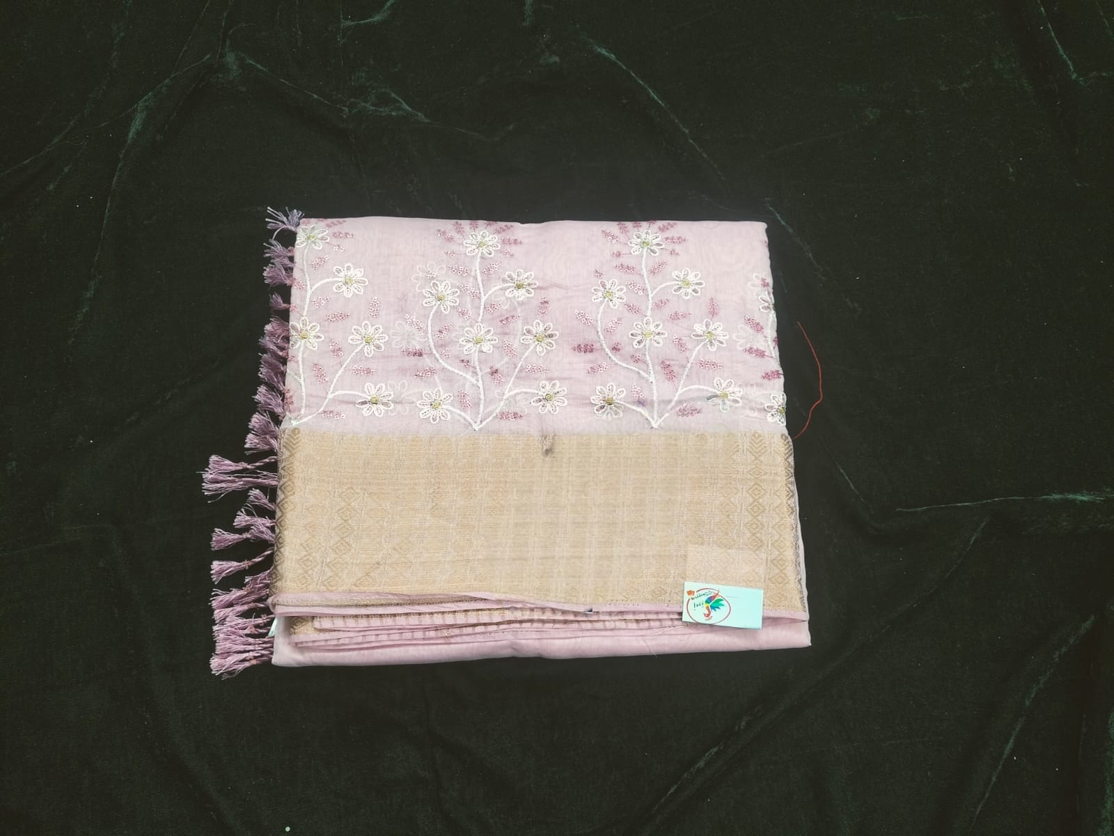 Name : Organza Silk Material : Silk Fabric : Tissue Design : embroidery and zari border Pallu : Self Blouse : Self