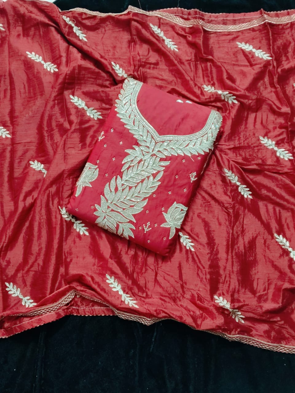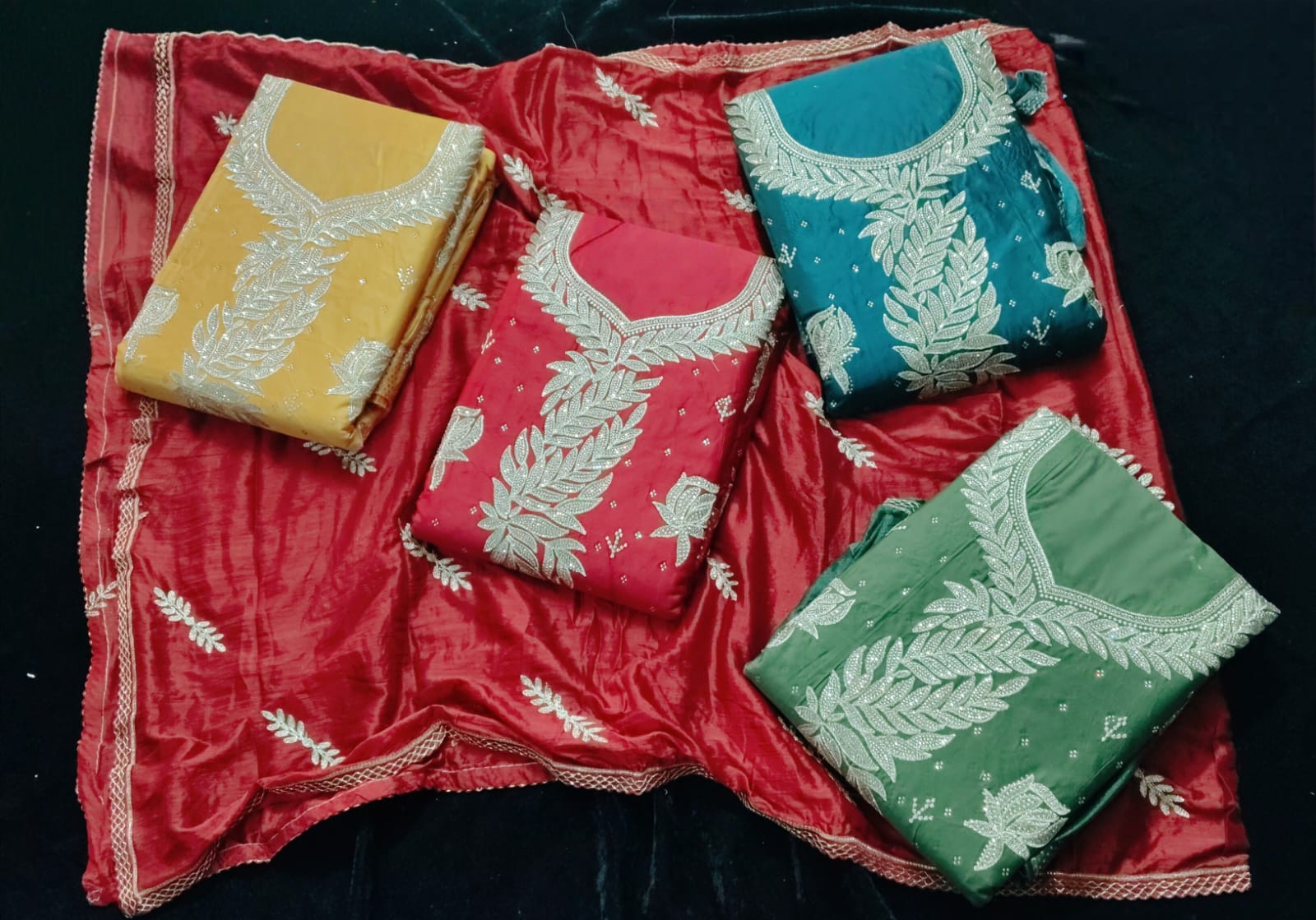 Name : Dress material Material : Cotton Fabric : Soft Design : Embroidery with stone design Dupatta : Embroidery designed dupatta