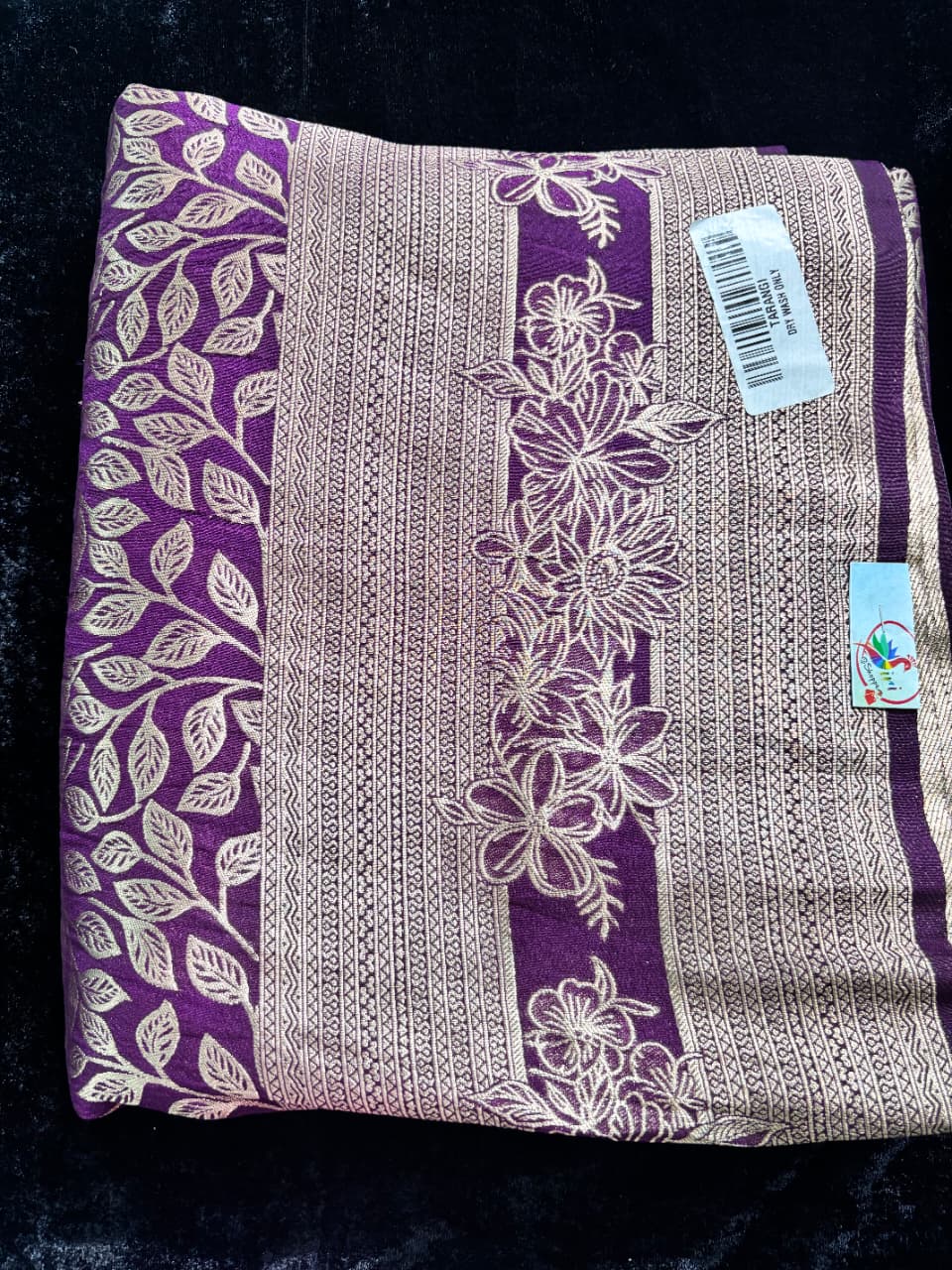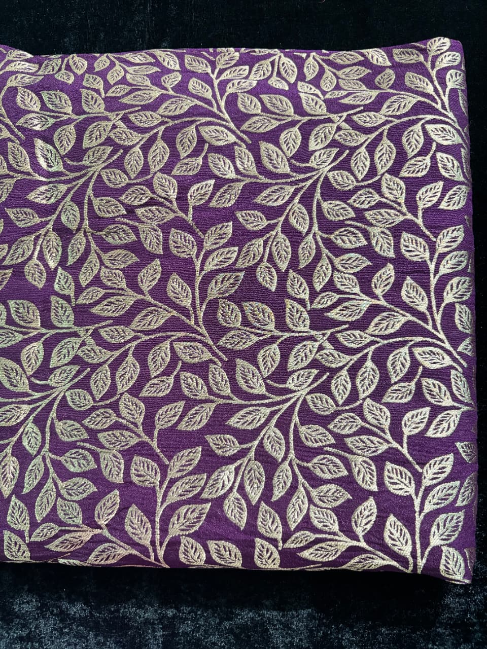 Purple saree with gold floral and leaves pattern covers the entire fabric