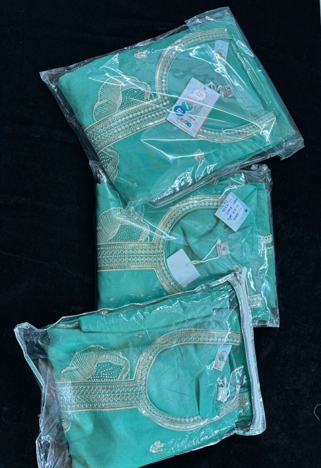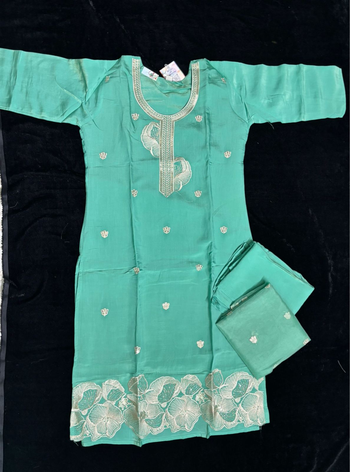 Green silk embroidered salwar kameez set featuring white thread work and a matching dupatta. Available in M, L, XL, XXL